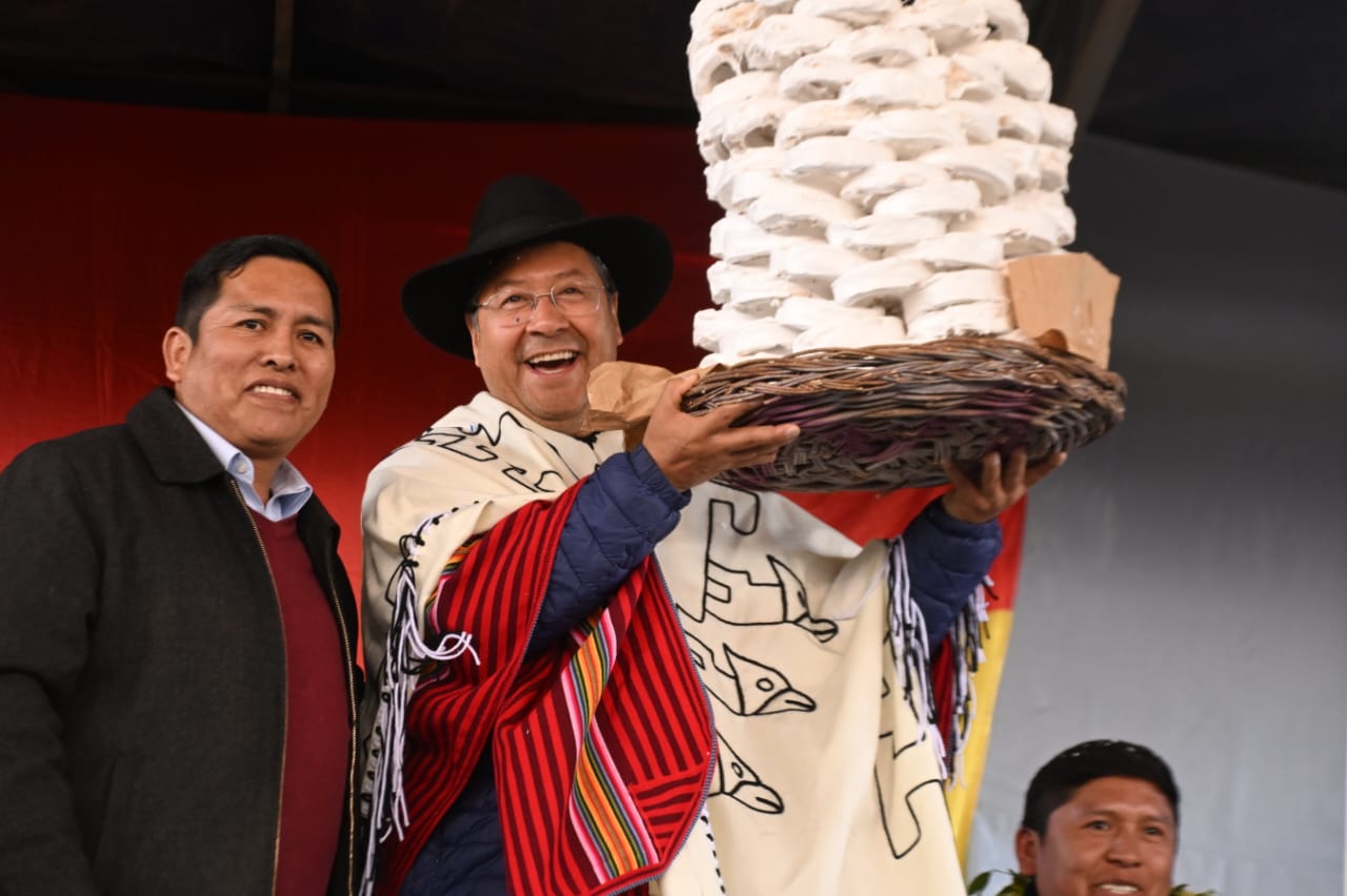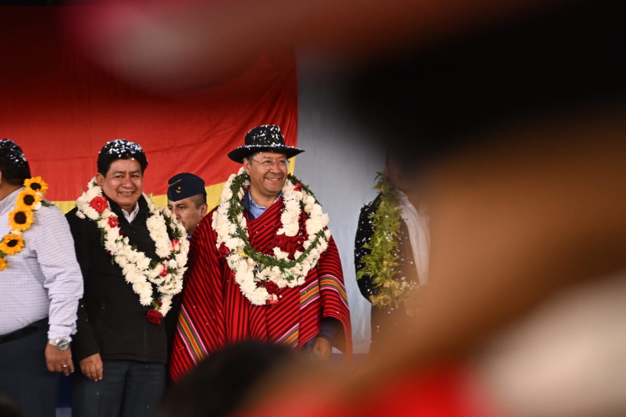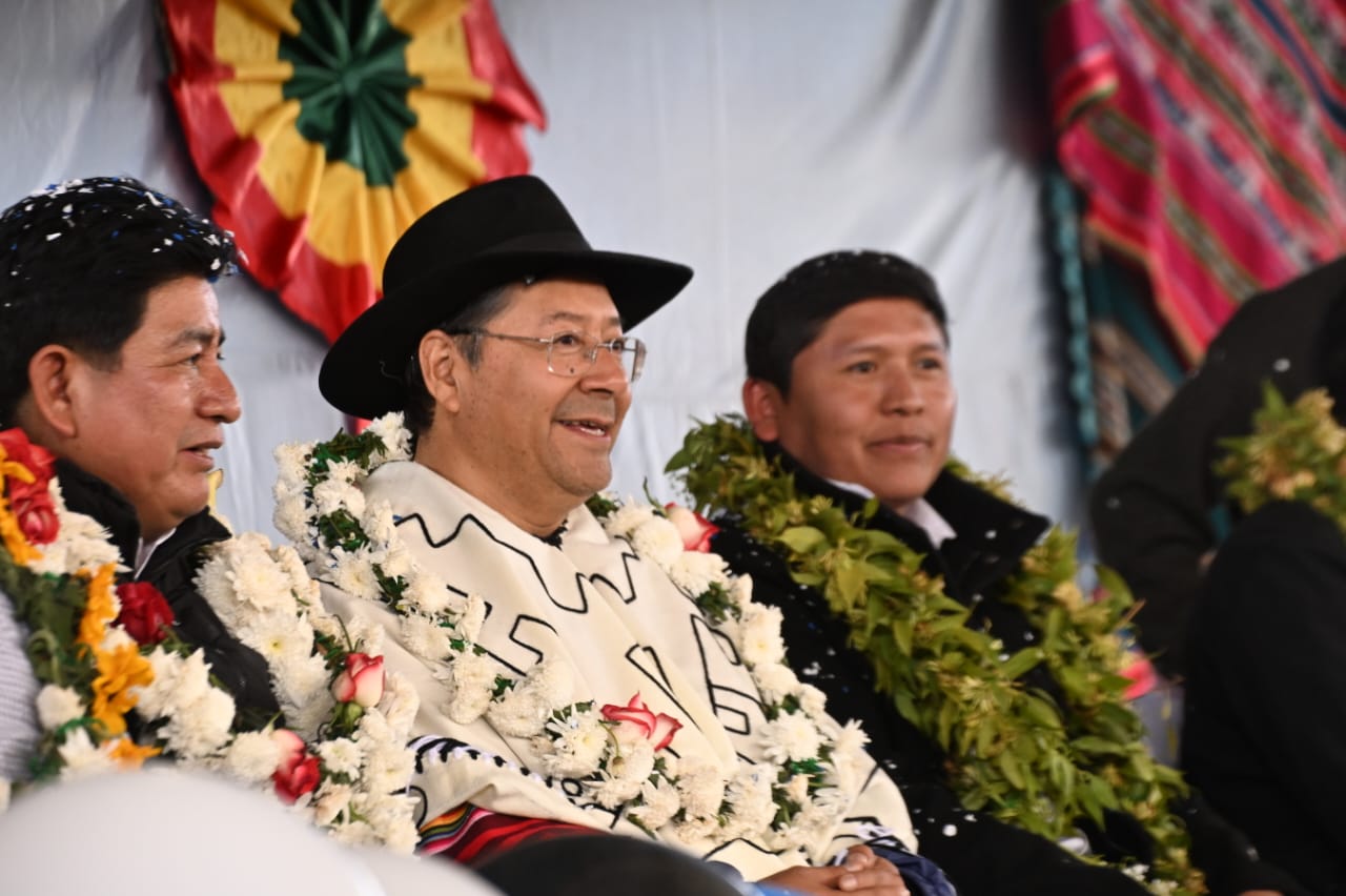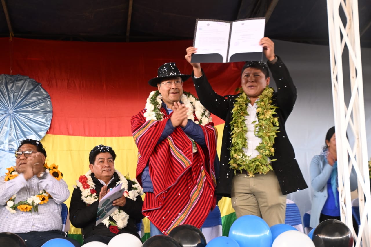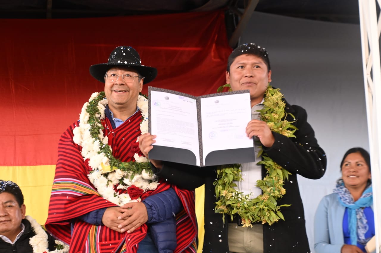 El presidente del Estado, Luis Arce Catacora, entrega en el municipio de Santiváñez la Ley 1550 que declara Prioridad Nacional incorporar a la Red Vial Fundamental la Carretera Integración entre los departamentos de Potosí y Cochabamba