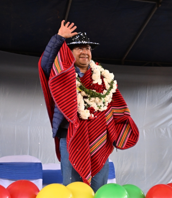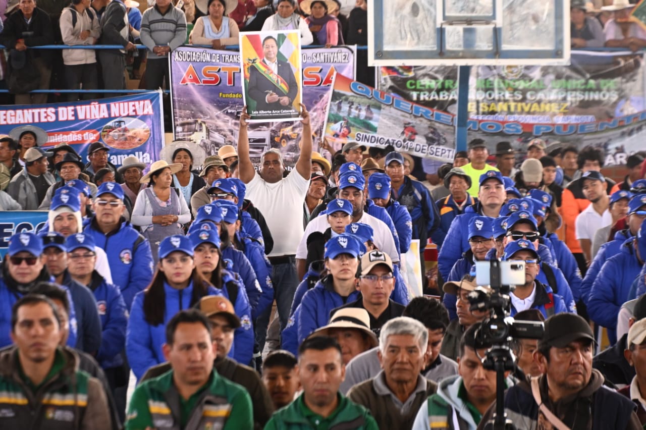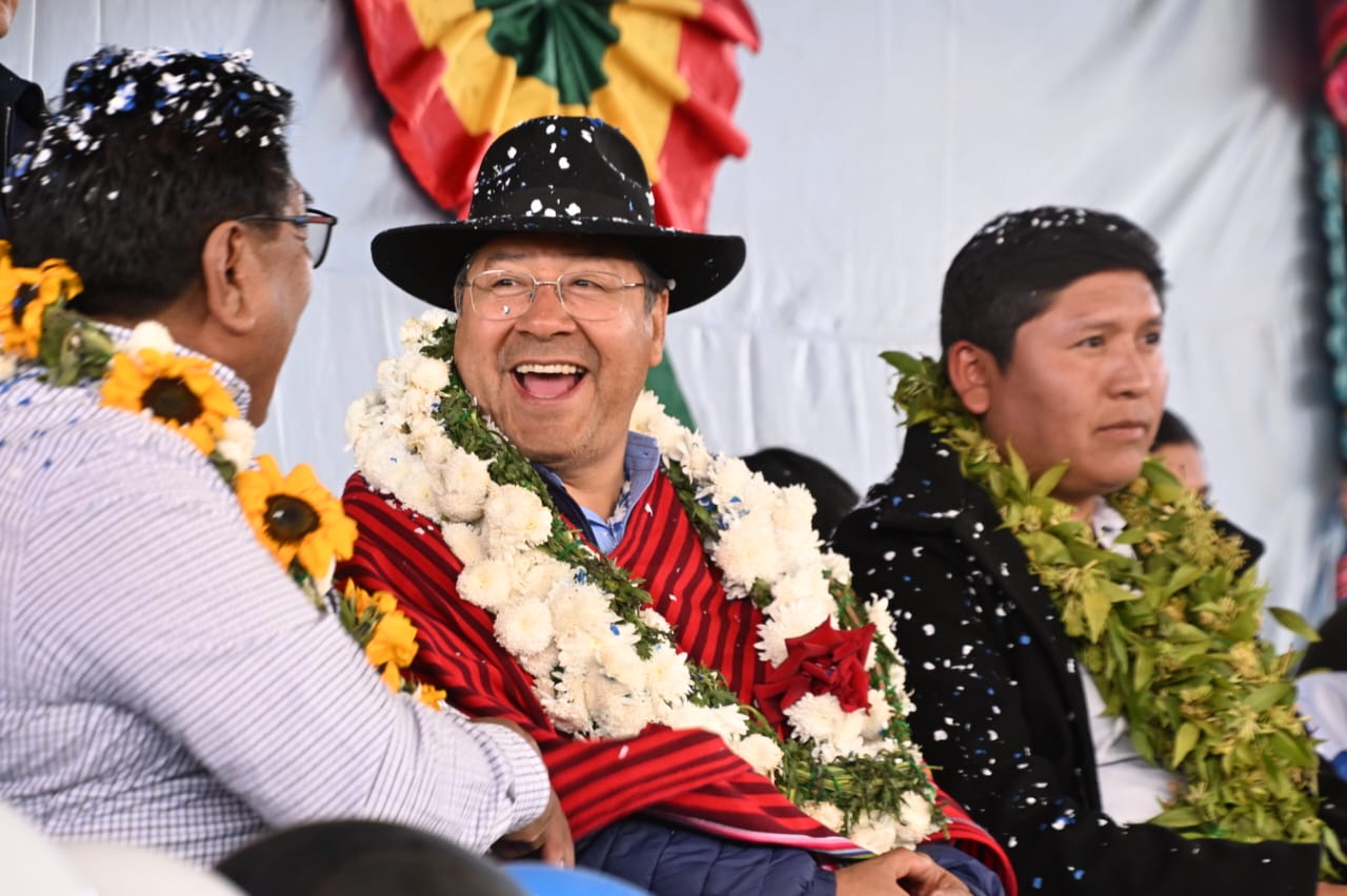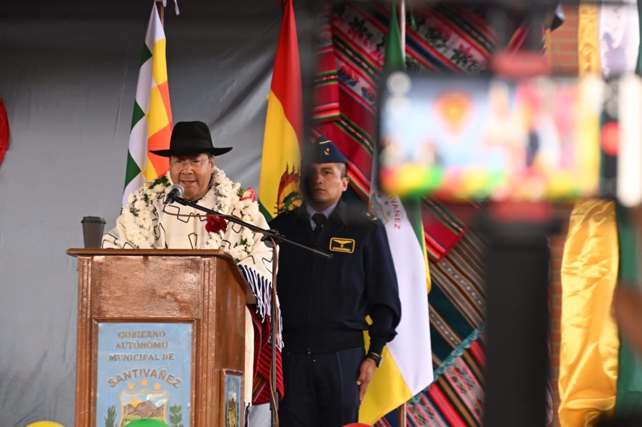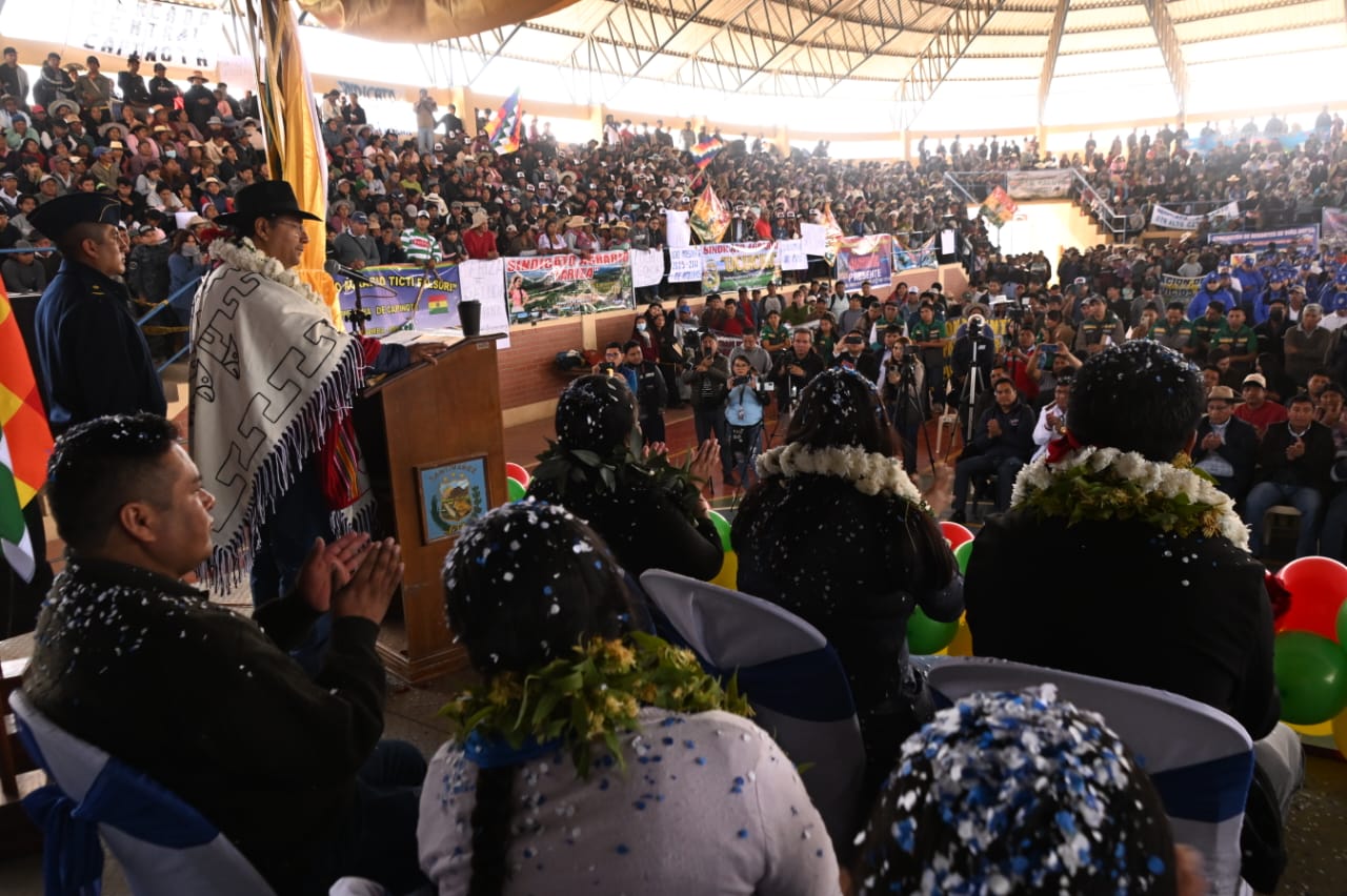 El presidente del Estado, Luis Arce Catacora, entrega en el municipio de Santiváñez la Ley 1550 que declara Prioridad Nacional incorporar a la Red Vial Fundamental la Carretera Integración entre los departamentos de Potosí y Cochabamba
