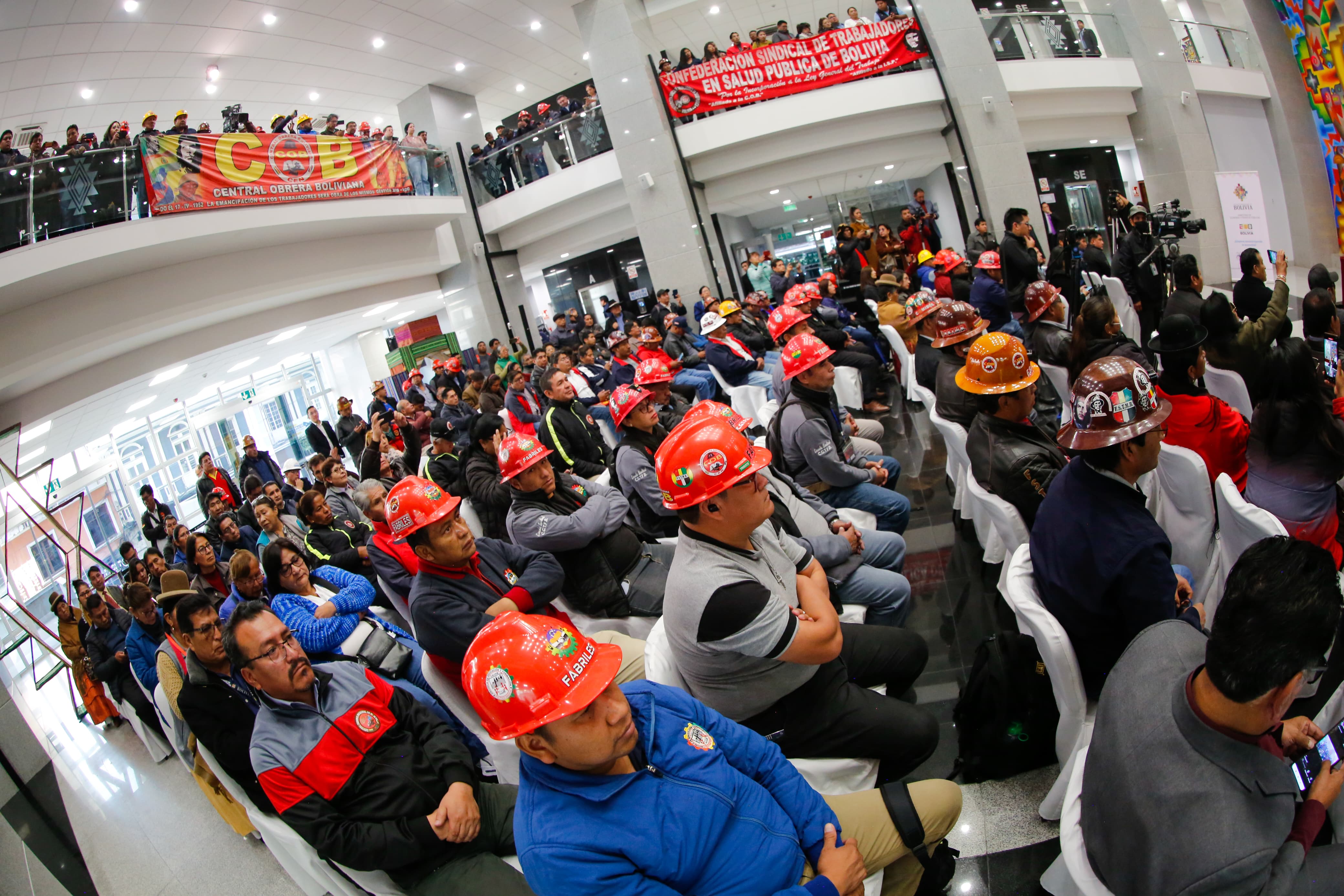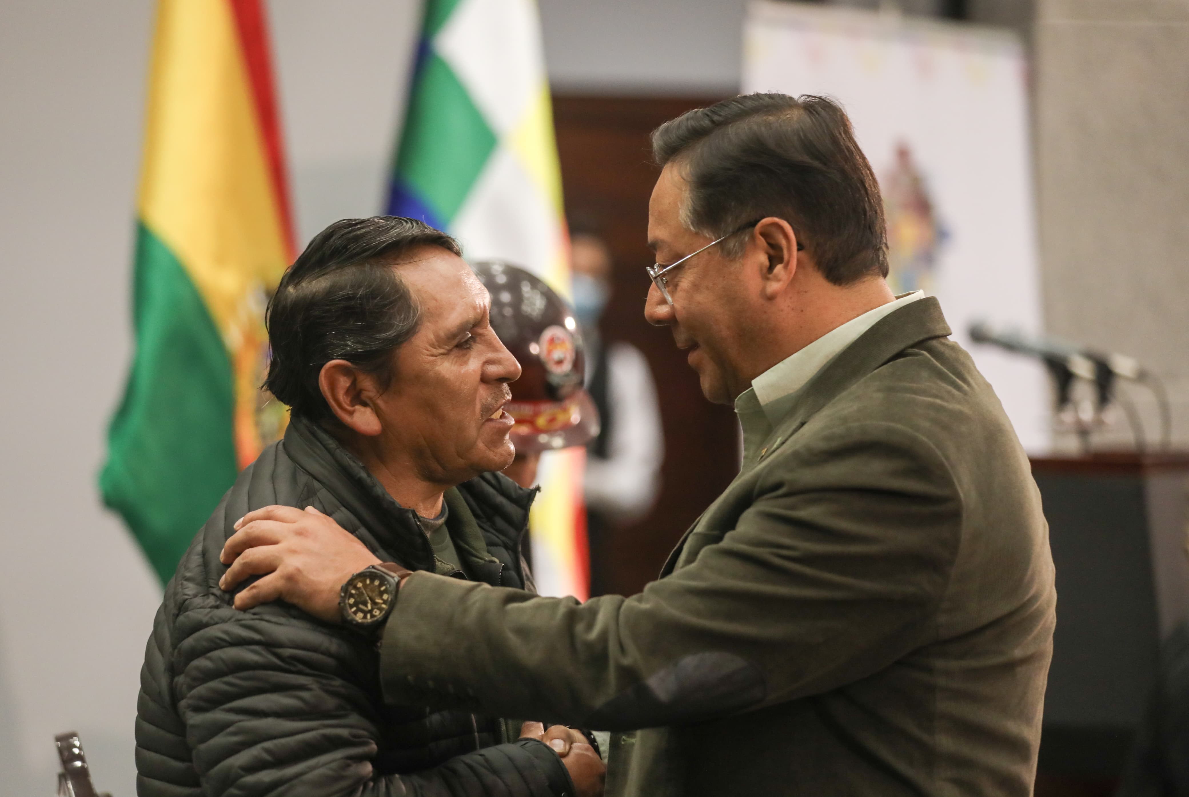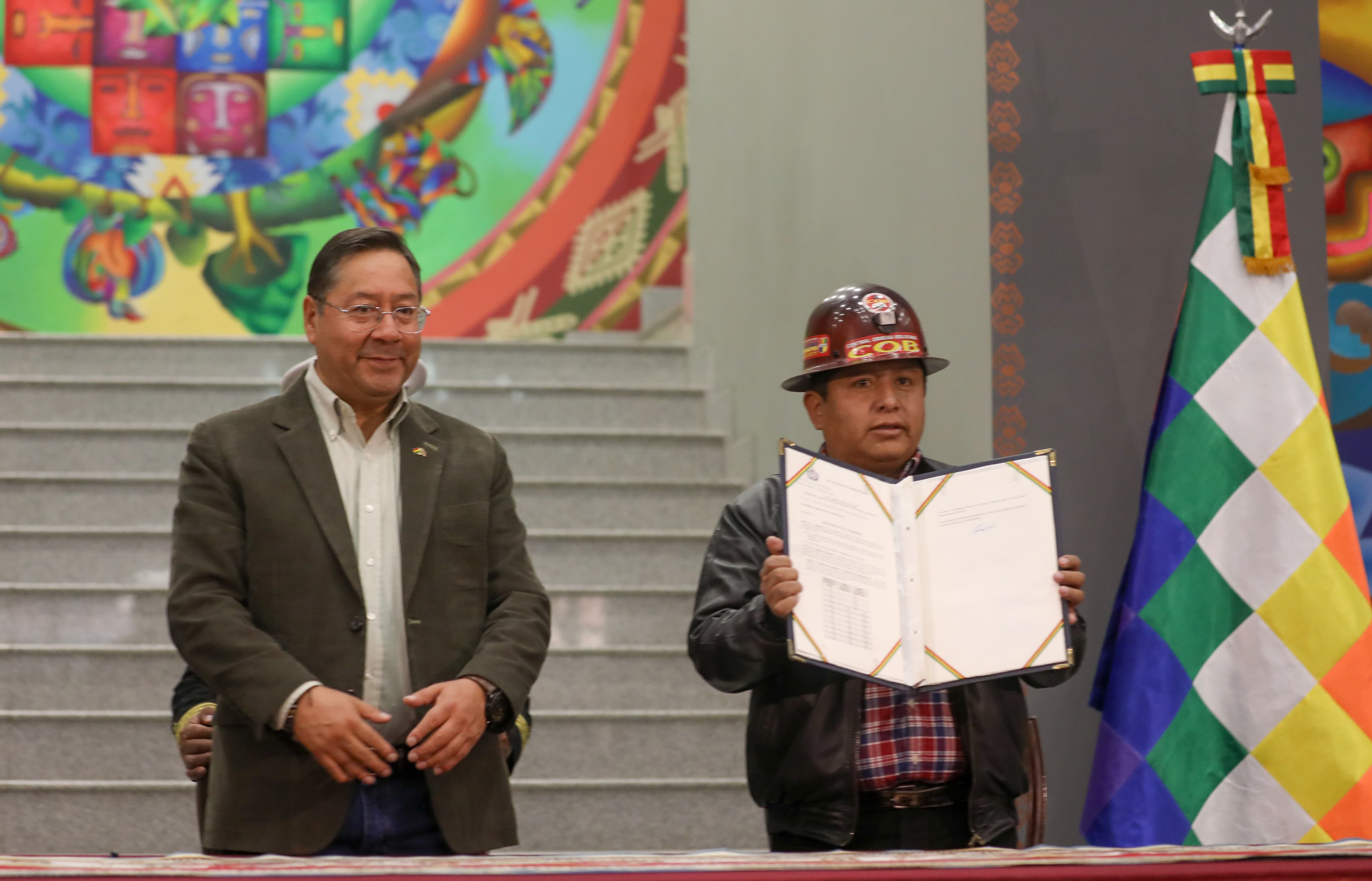 El presidente del Estado, Luis Arce Catacora, promulga la Ley de Modificación a los límites solidarios para la pensión solidaria de vejez del Sistema Integral de Pensiones, en Casa Grande del Pueblo