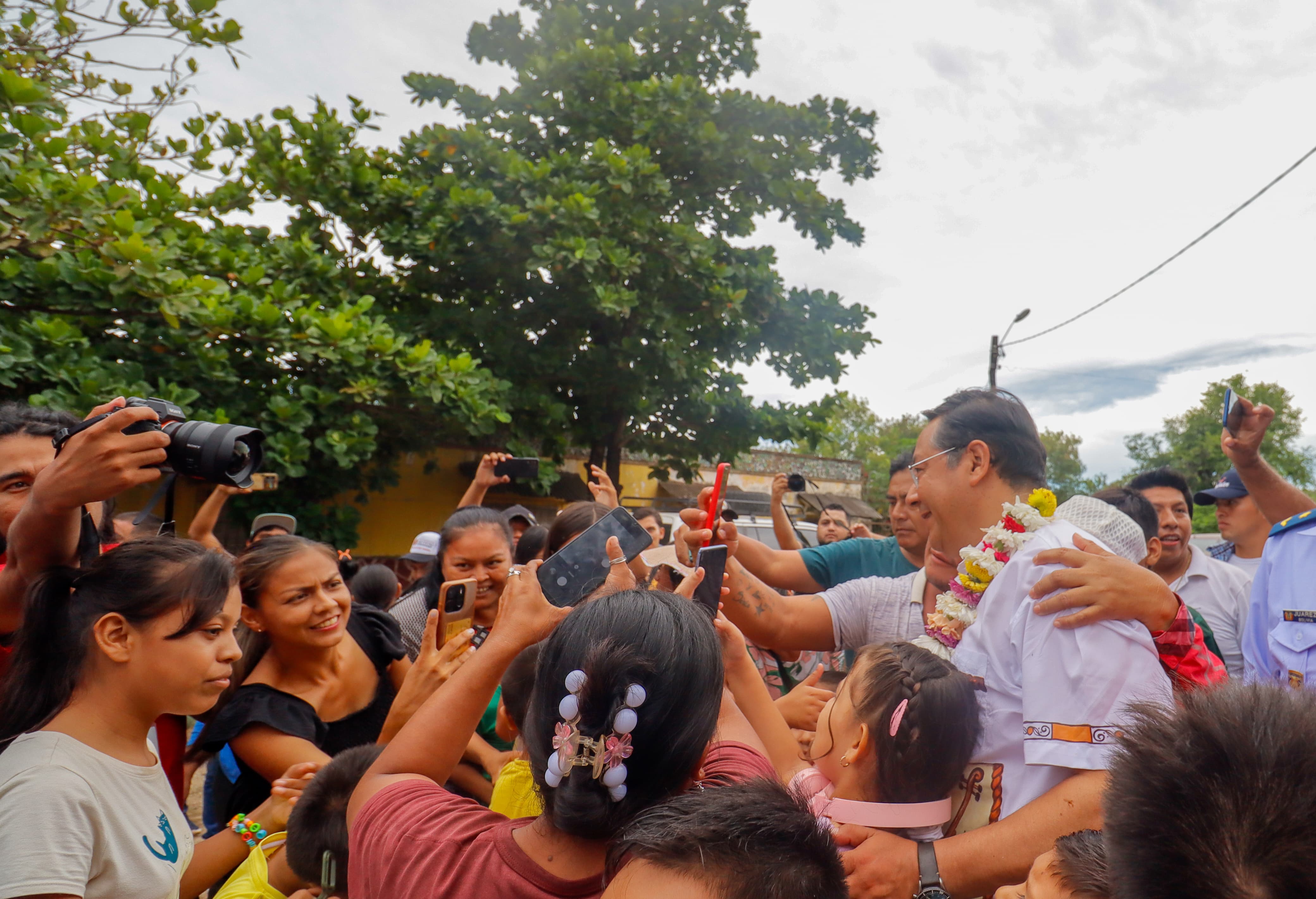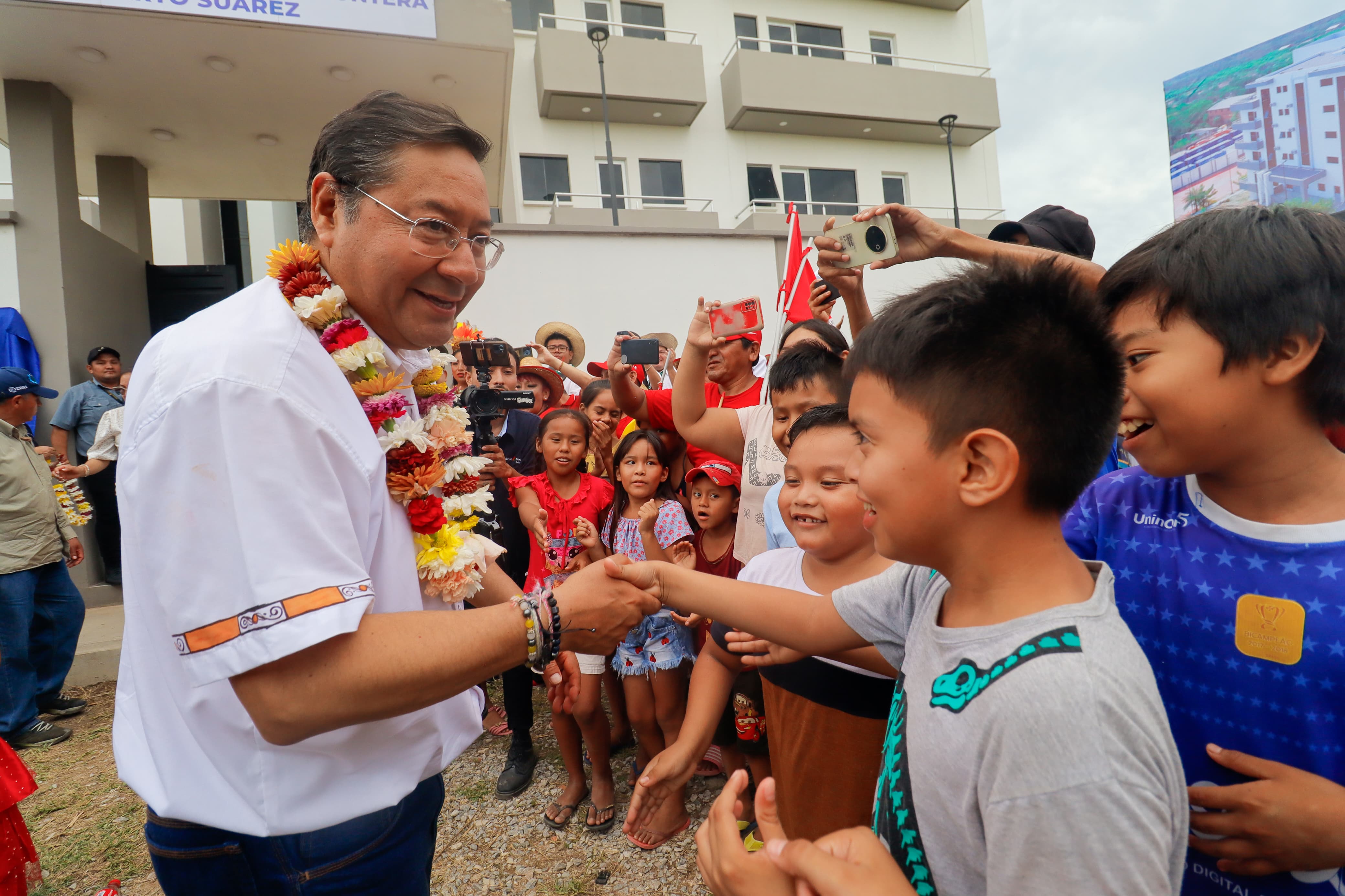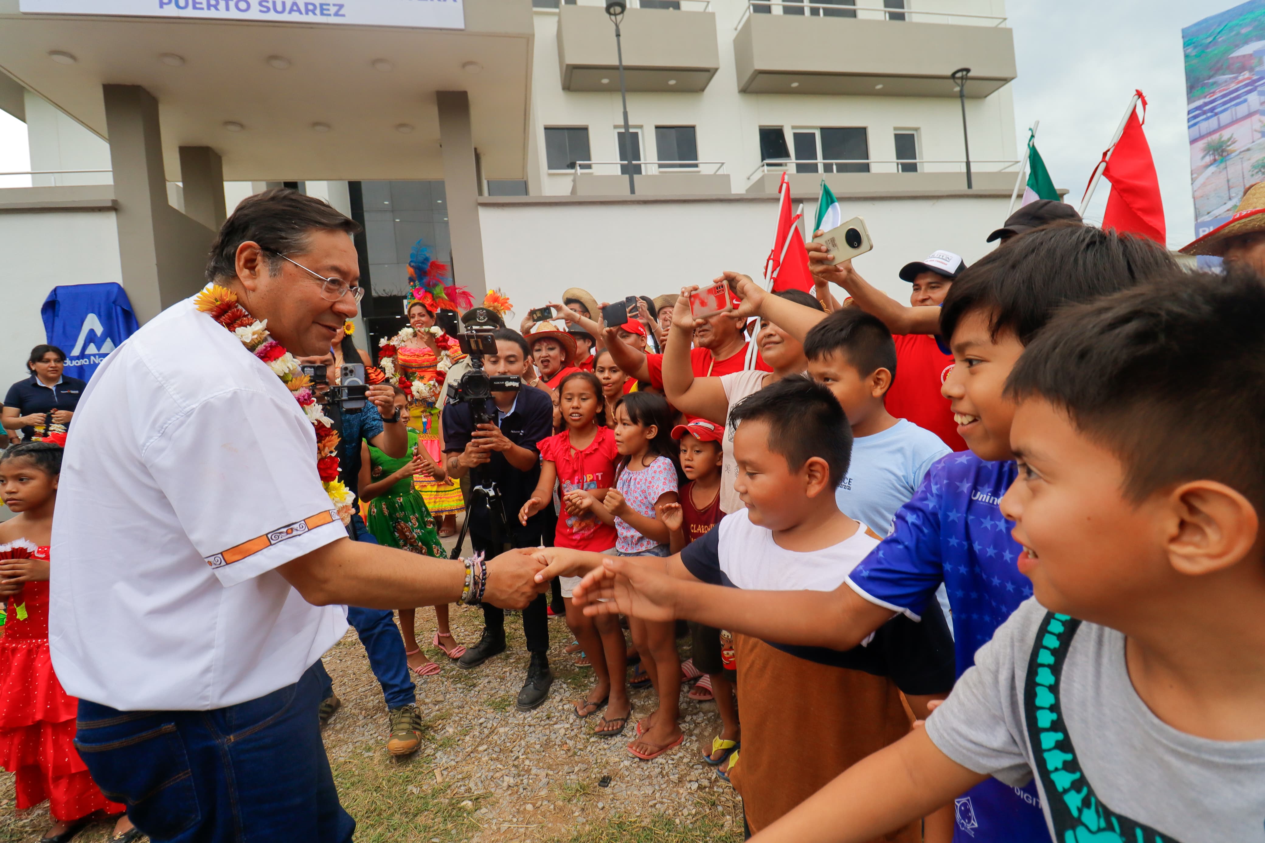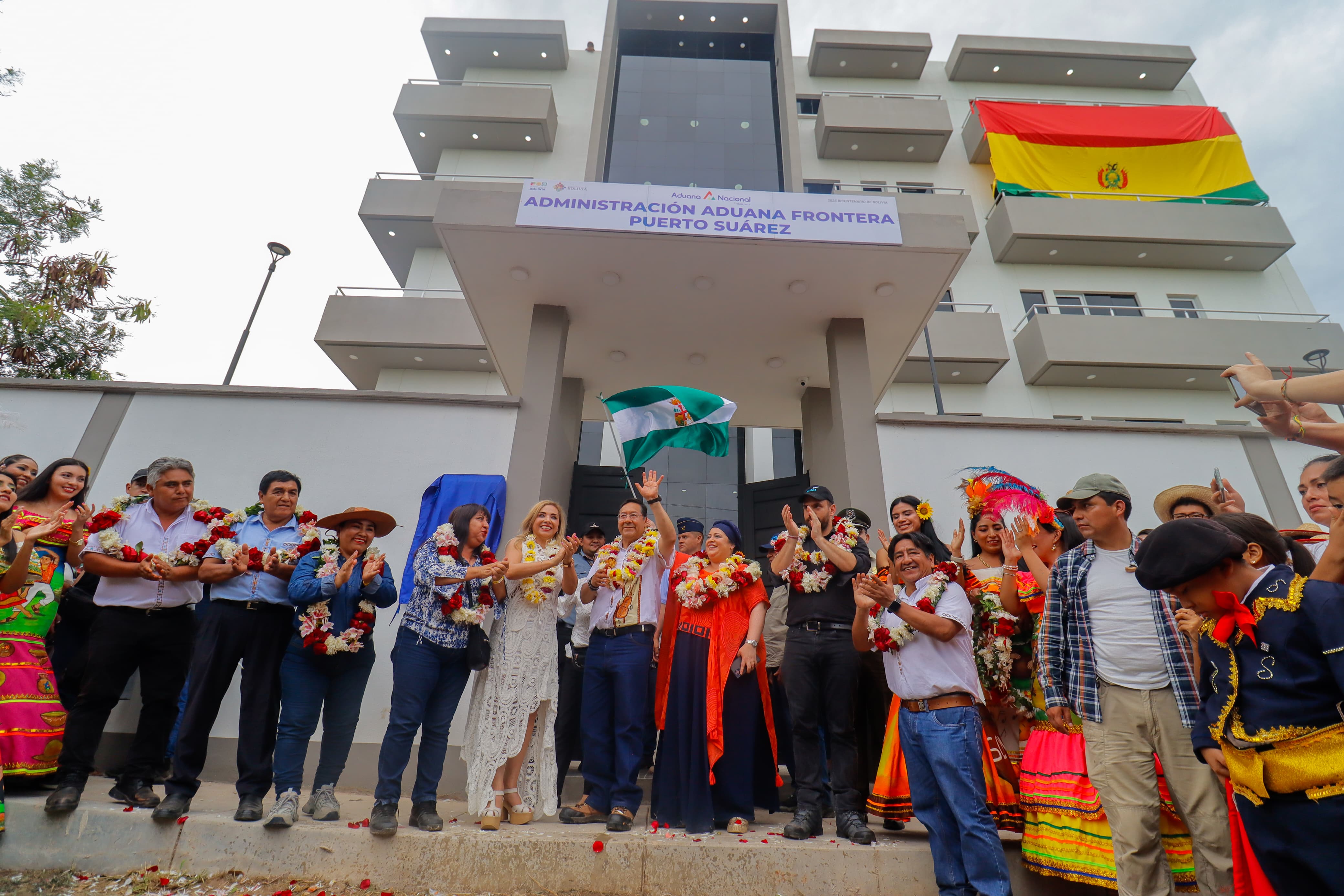 El Presidente del Estado Plurinacional de Bolivia, Luis Arce Catacora, realiza chˈalla y entrega de la Plataforma de Atención, Archivo y Vivienda en La Administración de Aduana Frontera, en el municipio de Puerto Suárez, Santa Cruz