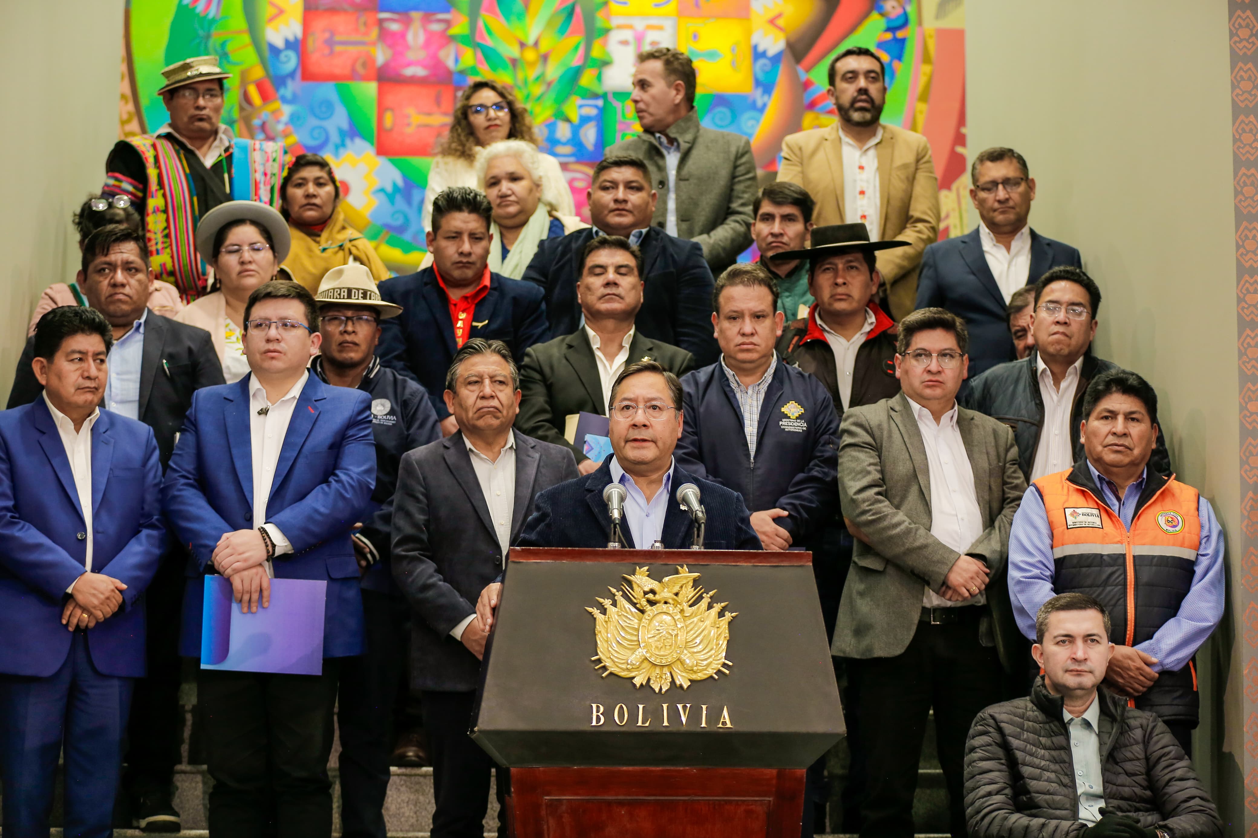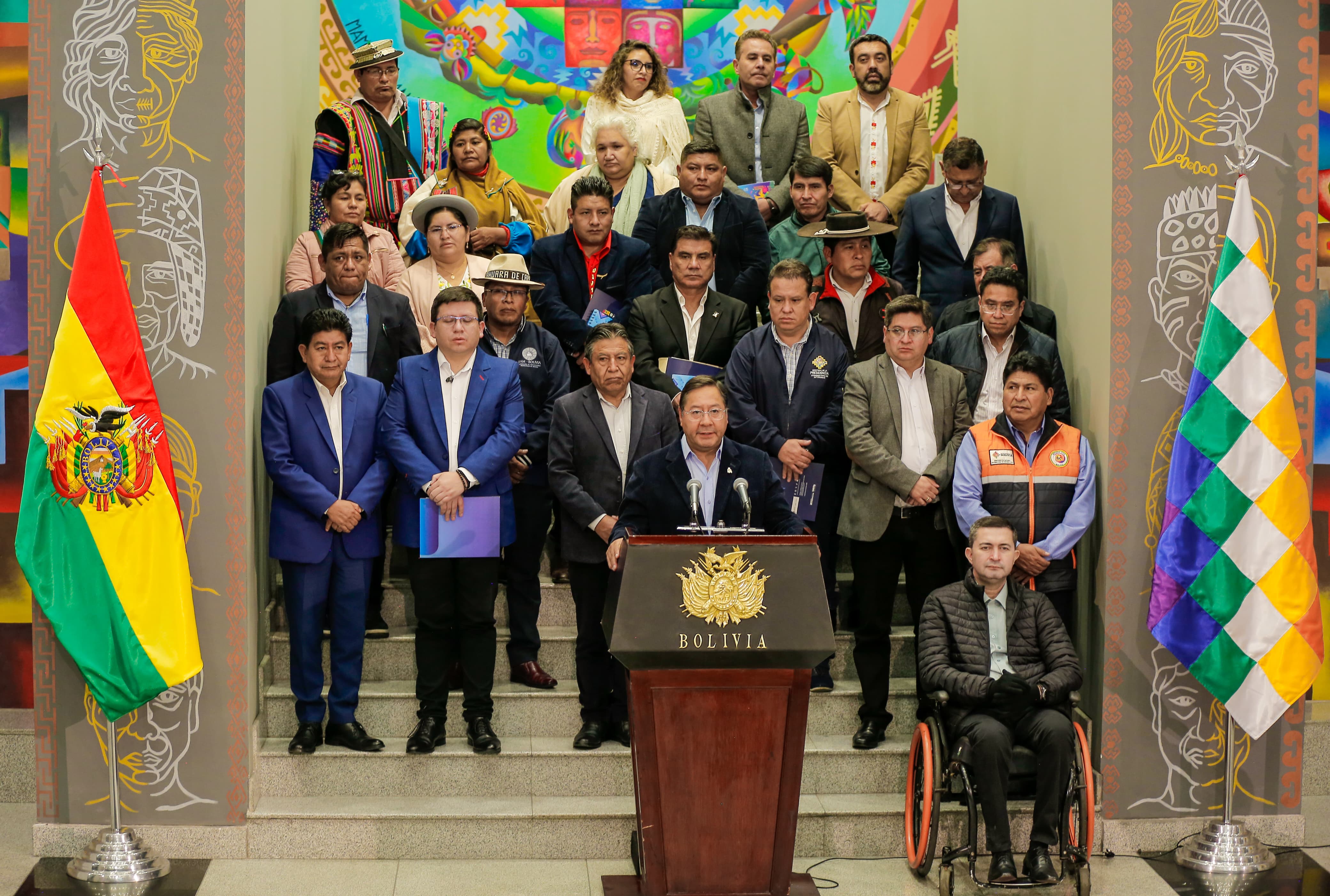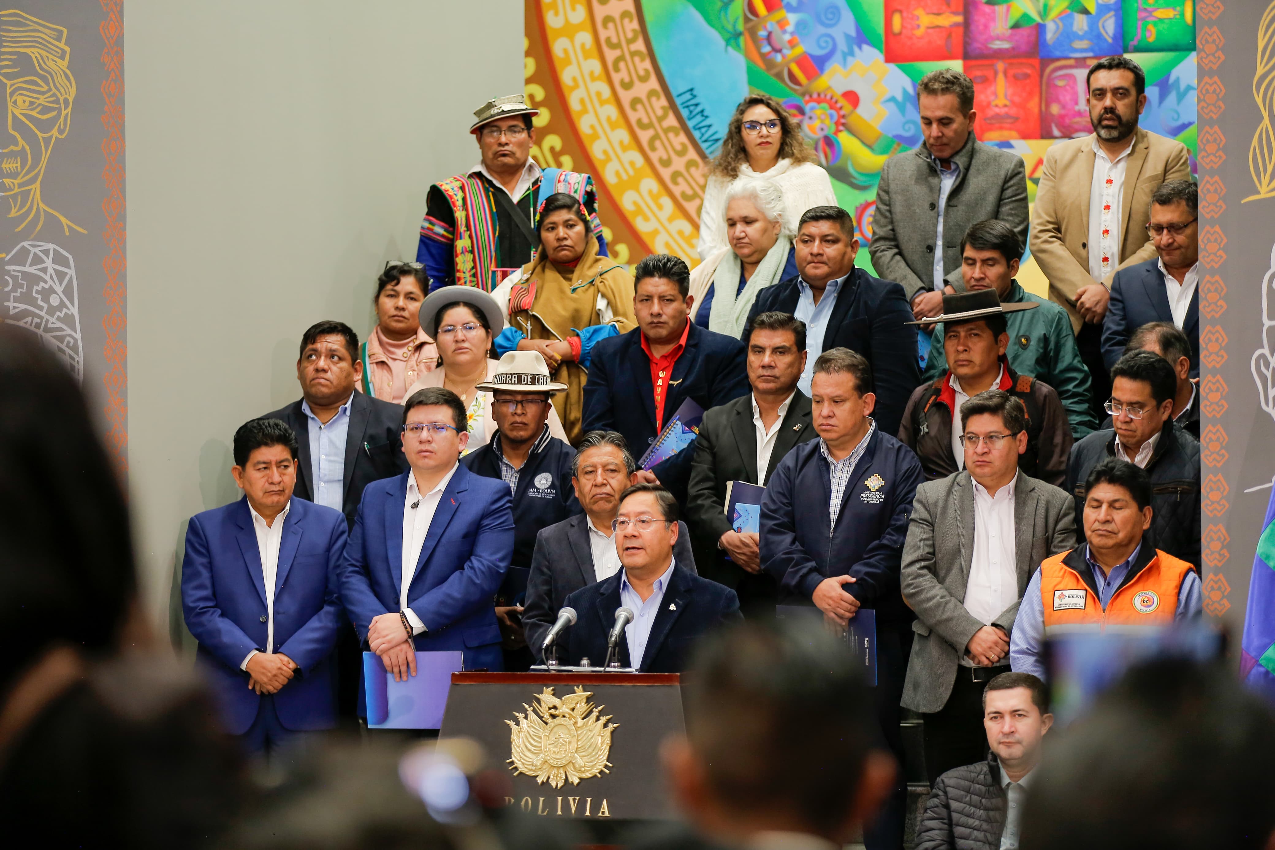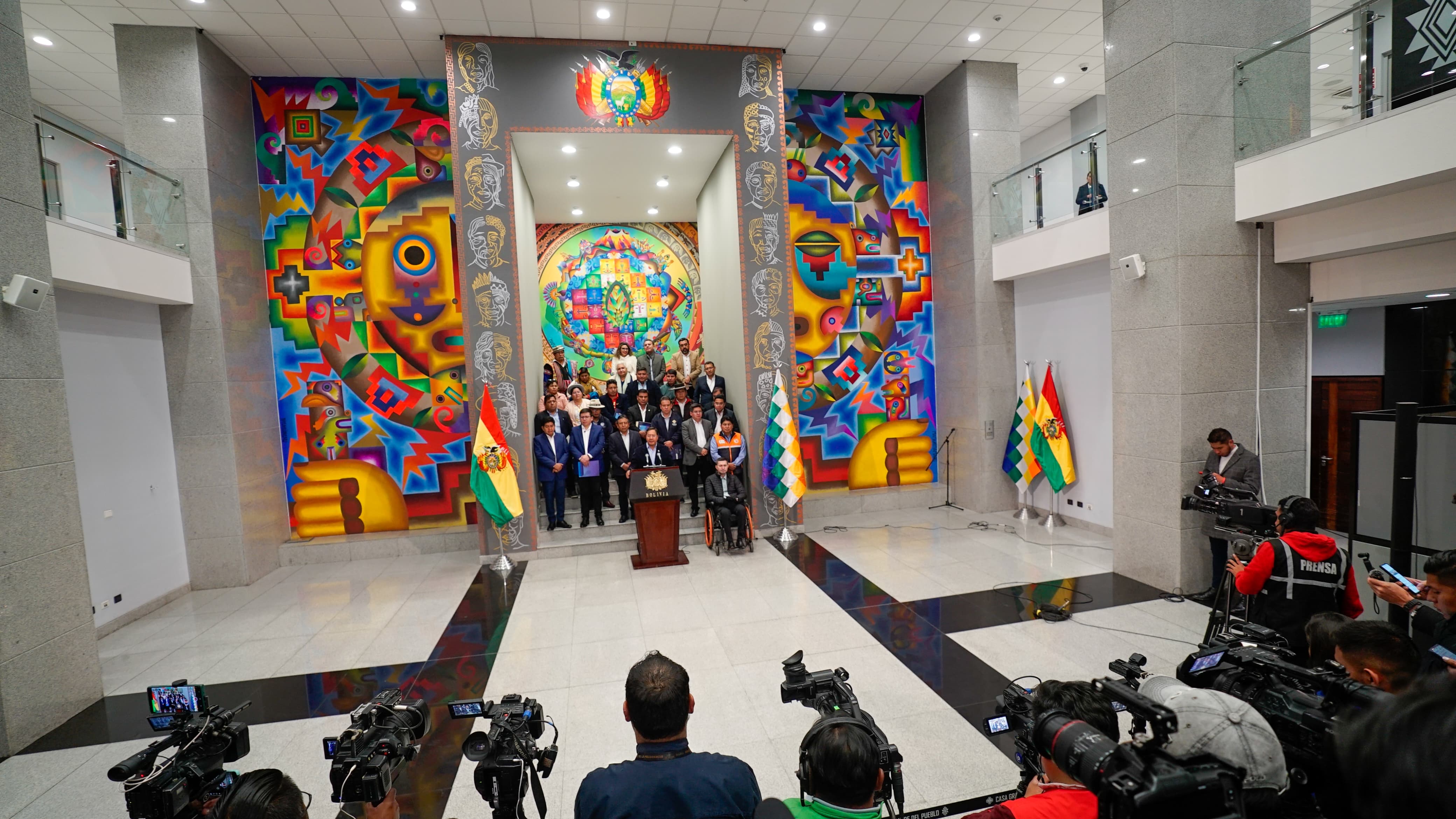 El Presidente del Estado Plurinacional de Bolivia, Luis Arce Catacora, participa en la conferencia de prensa del Consejo Nacional de Autonomías Extraordinario, en el Hall de la Casa Grande del Pueblo