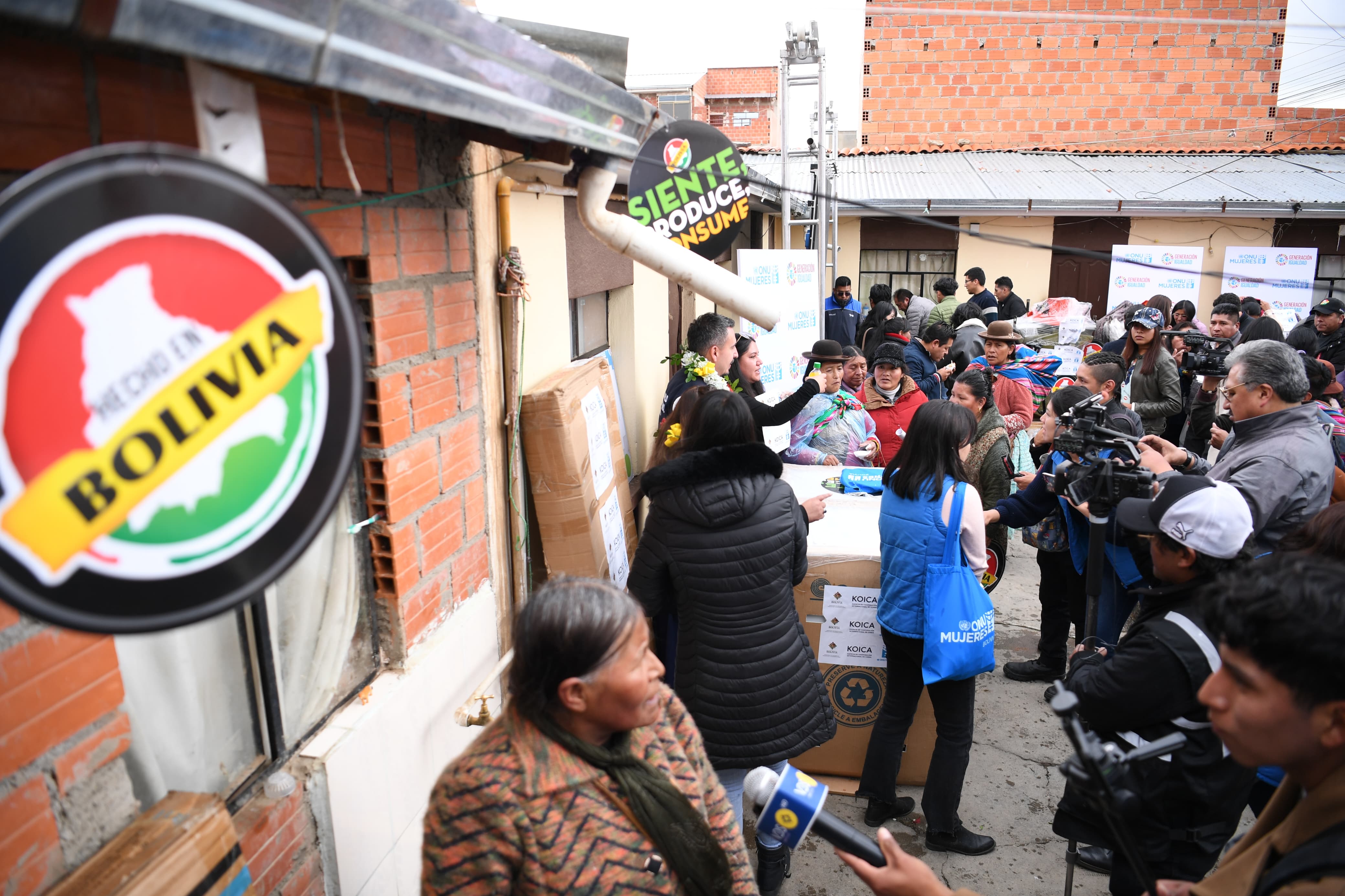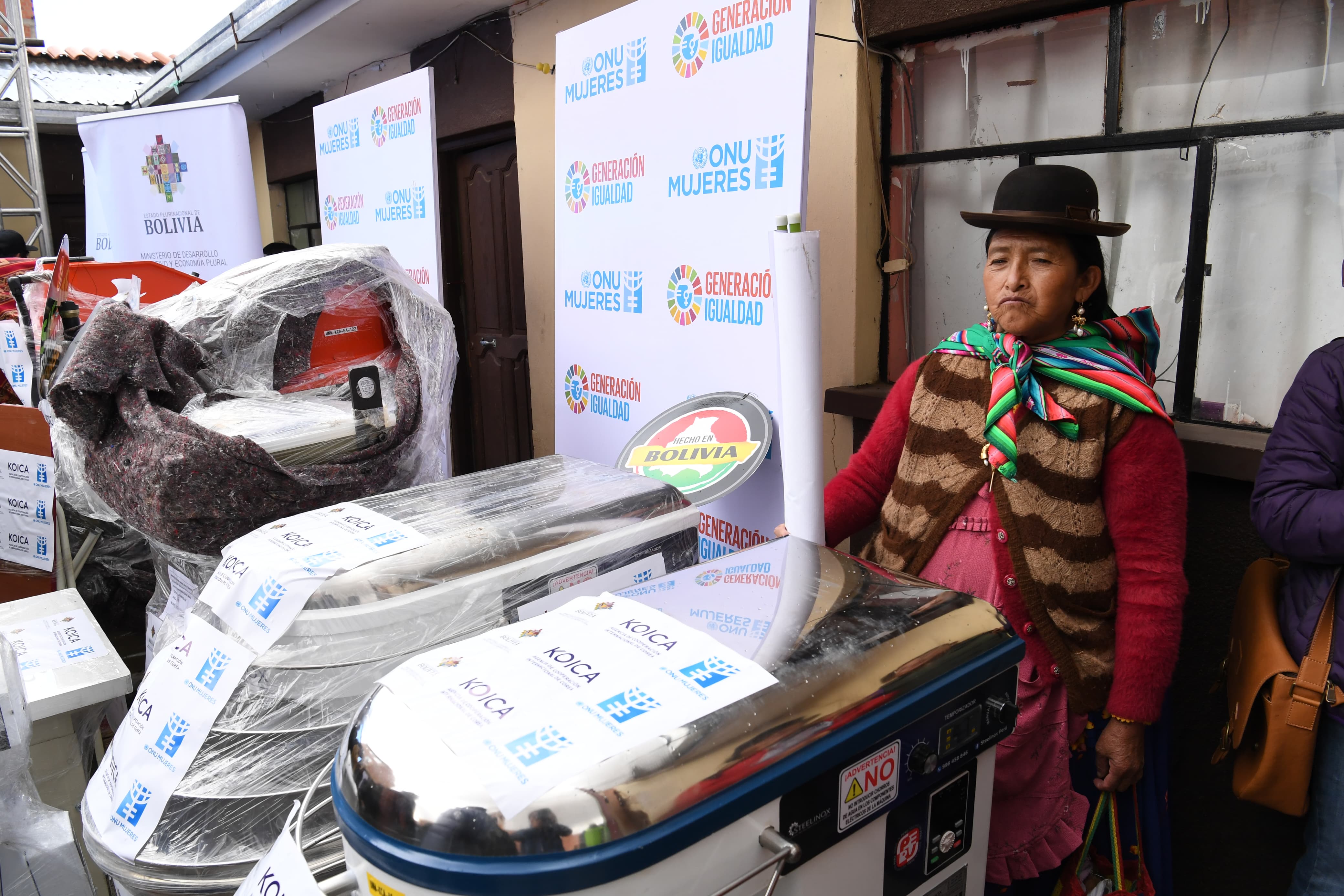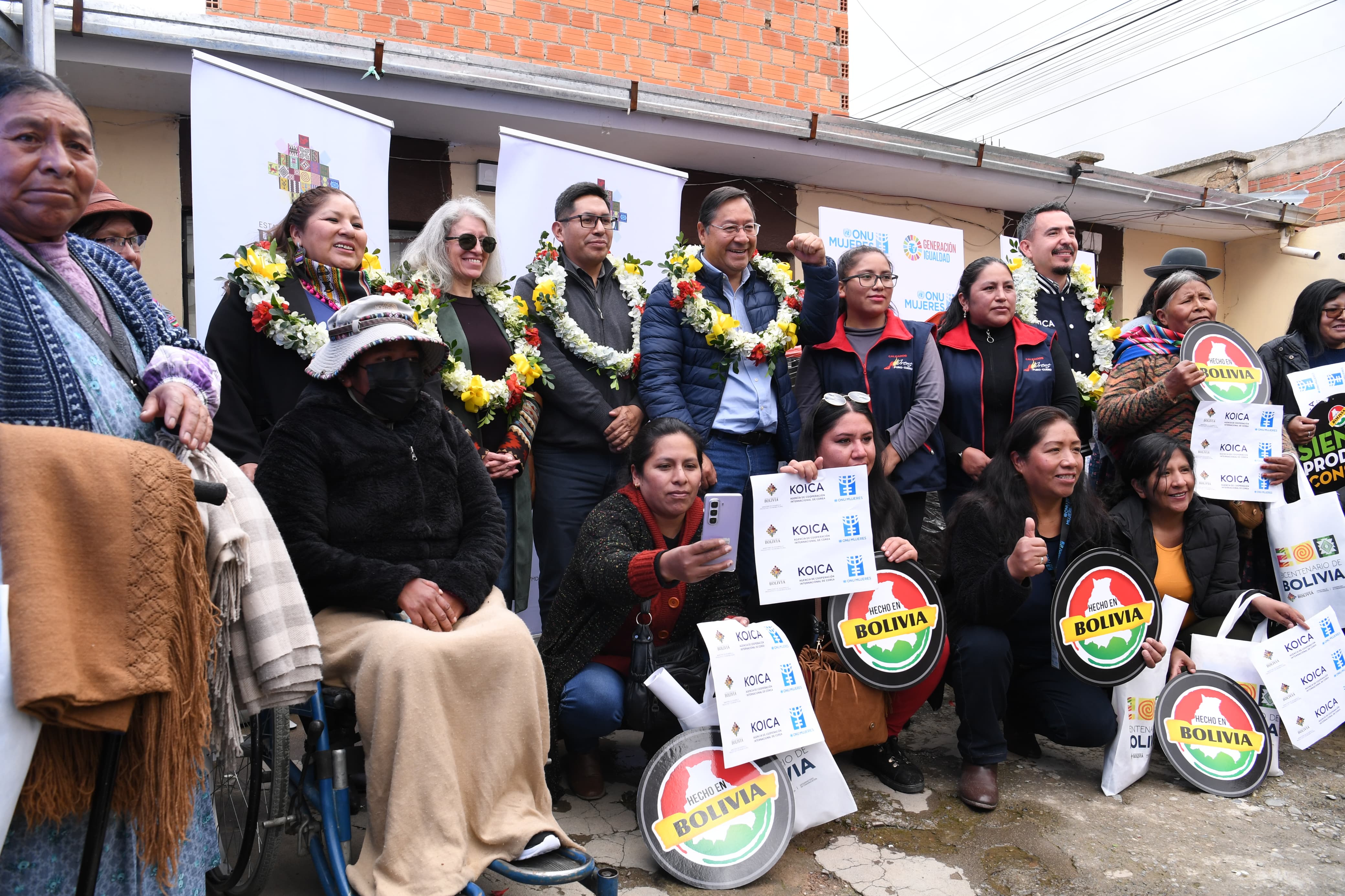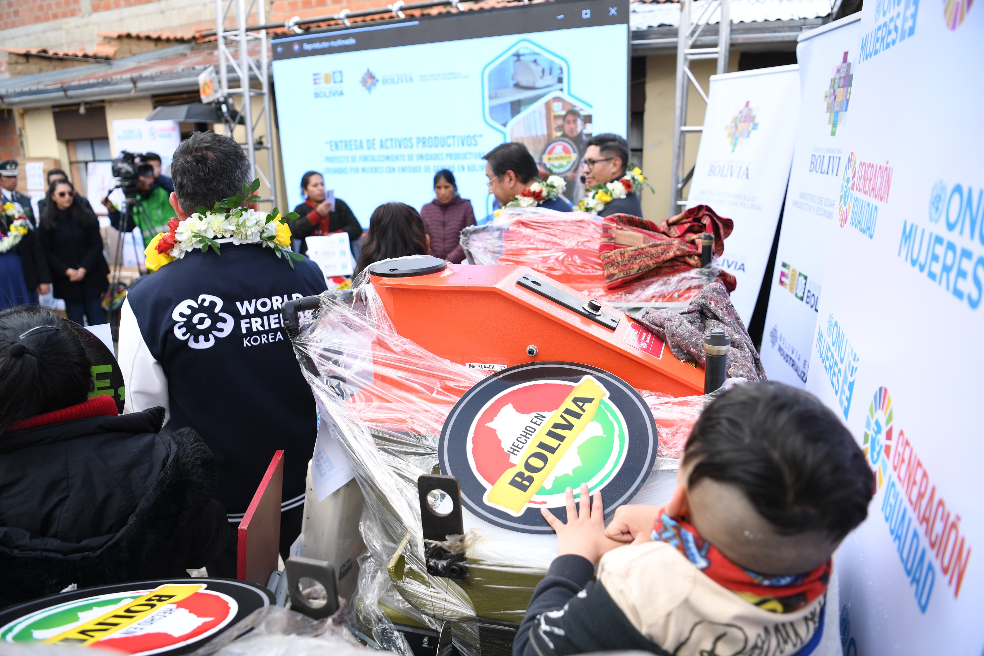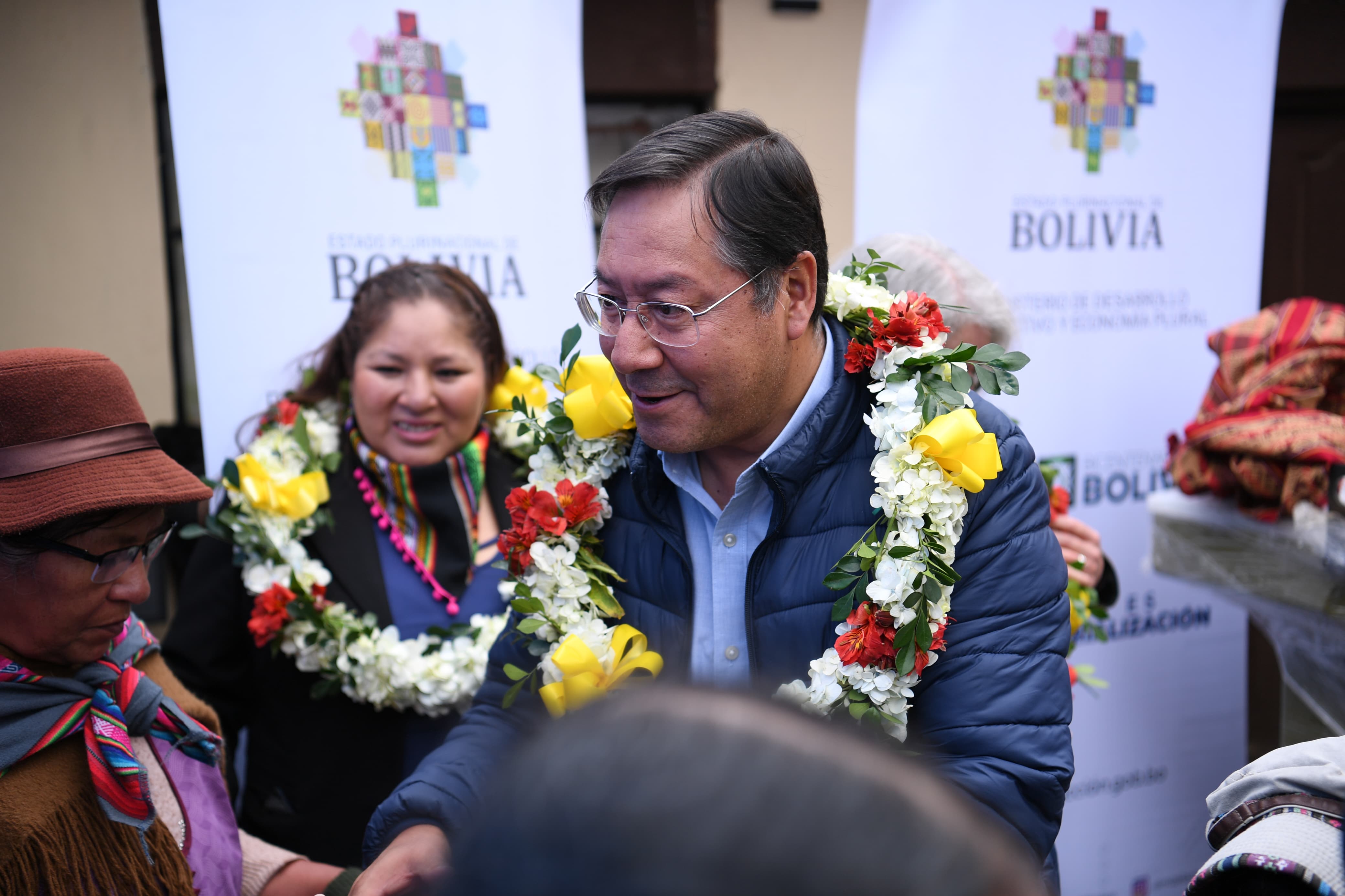 El Presidente del Estado, Luis Arce Catacora, entrega Activos Productivos a mujeres en El Alto, en el marco del Proyecto de Fortalecimiento de Unidades Productivas Lideradas por Mujeres con Enfoque de Género en Bolivia
