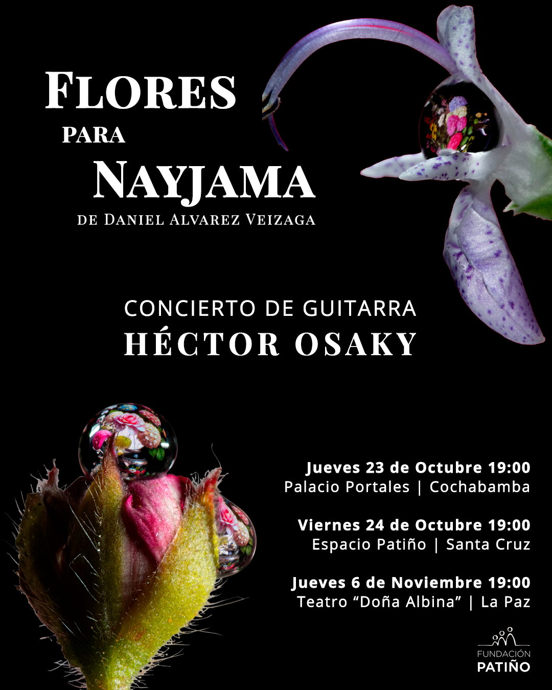 “Flores para Nayjama” tendrá tres presentaciones en el país: Cochabamba: Jueves 23 de octubre, 19:00, en el Palacio Portales. Santa Cruz: Viernes 24 de octubre, 19:00, en el Espacio Patiño. La Paz (Cierre): Jueves 6 de noviembre, 19:00, Teatro “Doña Albina” en el Espacio Patiño (Av. Ecuador, esquina Rosendo Gutiérrez).