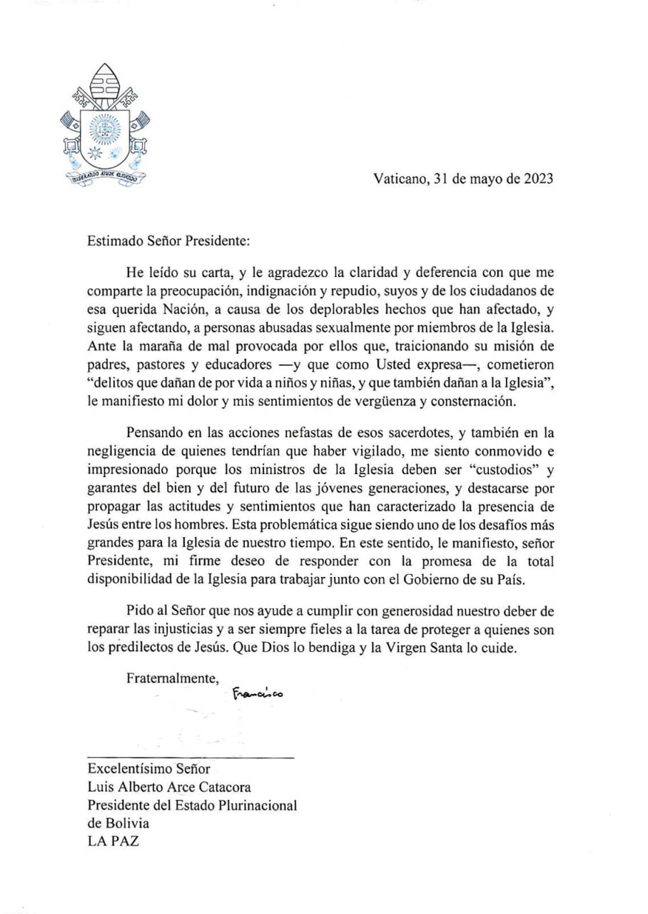 El papa Francisco respondió a una carta que le envió el presidente Arce, donde el presidente se declaró “consternado e indignado” por los casos de pederastia denunciados tras las confesiones publicadas del extinto jesuita Alfonso Pedrajas, quien reveló que abusó sexualmente de al menos 85 menores y adolescentes, la mayoría en el Colegio Juan XXIII de Cochabamba.