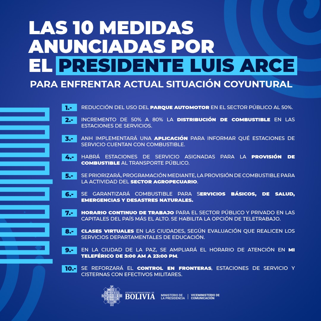 “Todas estas medidas están dirigidas a mejorar la organización en nuestra sociedad, apoyar a la producción y cuidar la economía nacional. Nosotros, como estamos viendo en algunas redes sociales, no vamos a tomar medidas como devaluación y levantar la subvención, que esa medida no resuelve el problema que hoy enfrenta nuestro país”, afirmó en un mensaje a Bolivia rodeado por sus ministros.