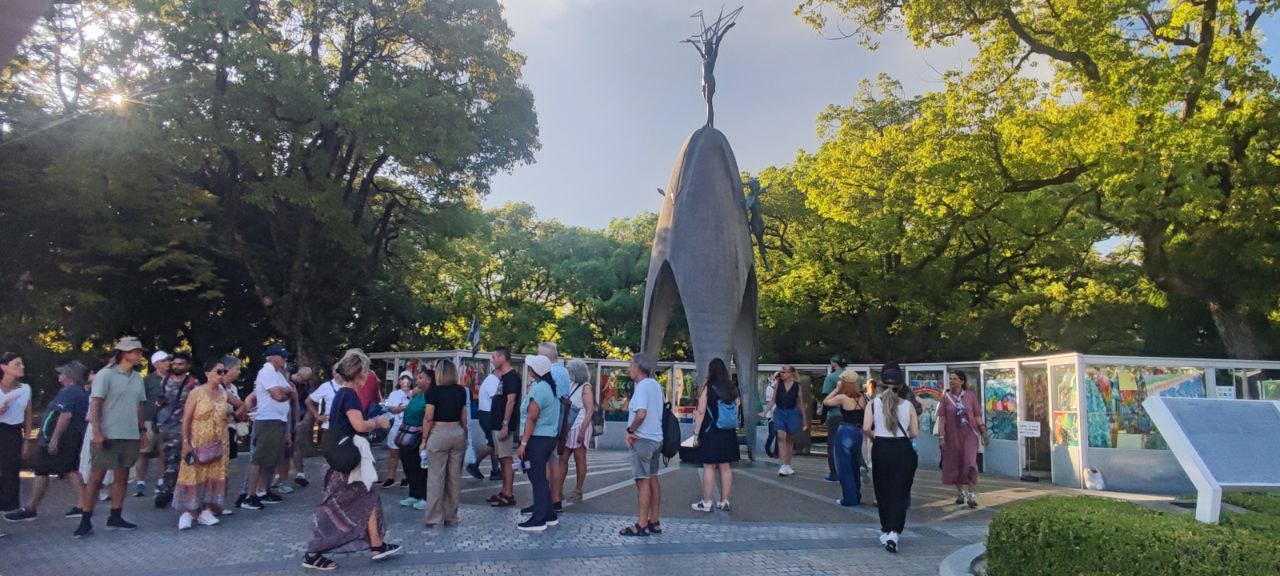 Arropados con vestimenta holgada, cámara fotográfica en mano y guiados por una intérprete, la comisión de periodistas de Sudamérica comienza el recorrido por el Parque Memorial de la Paz, un lugar emblemático, construido en 1954, que honra la historia de esta ciudad.