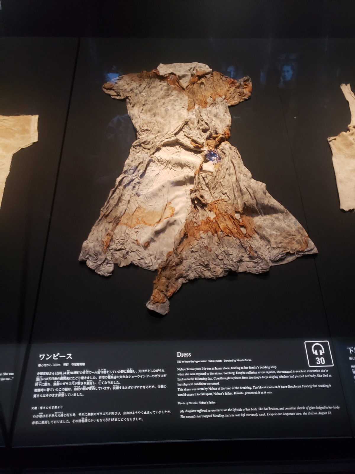 “Este vestido fue usado por Nobue en el momento del bombardeo. ‘Las manchas de sangre se han decolorado’. Temiendo que al lavarlo se deshiciera, el padre de Nobue, Hiroshi, lo conservó tal como estaba”, se oye a través de la audioguía.