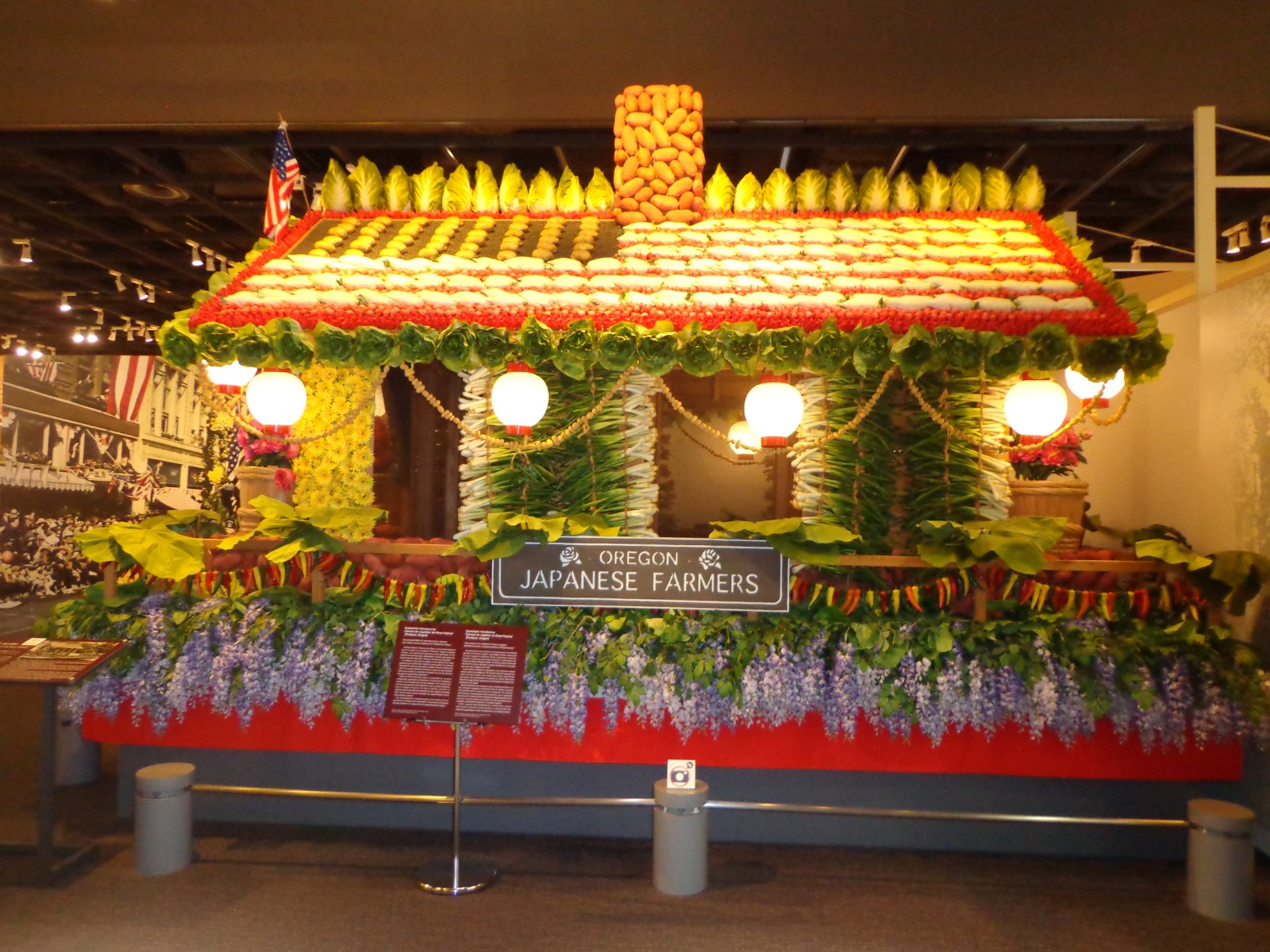 Al ingresar a la exposición, el punto de partida es desde una colorida carroza decorada con verduras artificiales, que parecieran apetitosamente reales. Se trata de la réplica con la que los japoneses que emigraron a Portland, Oregón, Estados Unidos, participaron en el Festival de las Rosas en 1921.