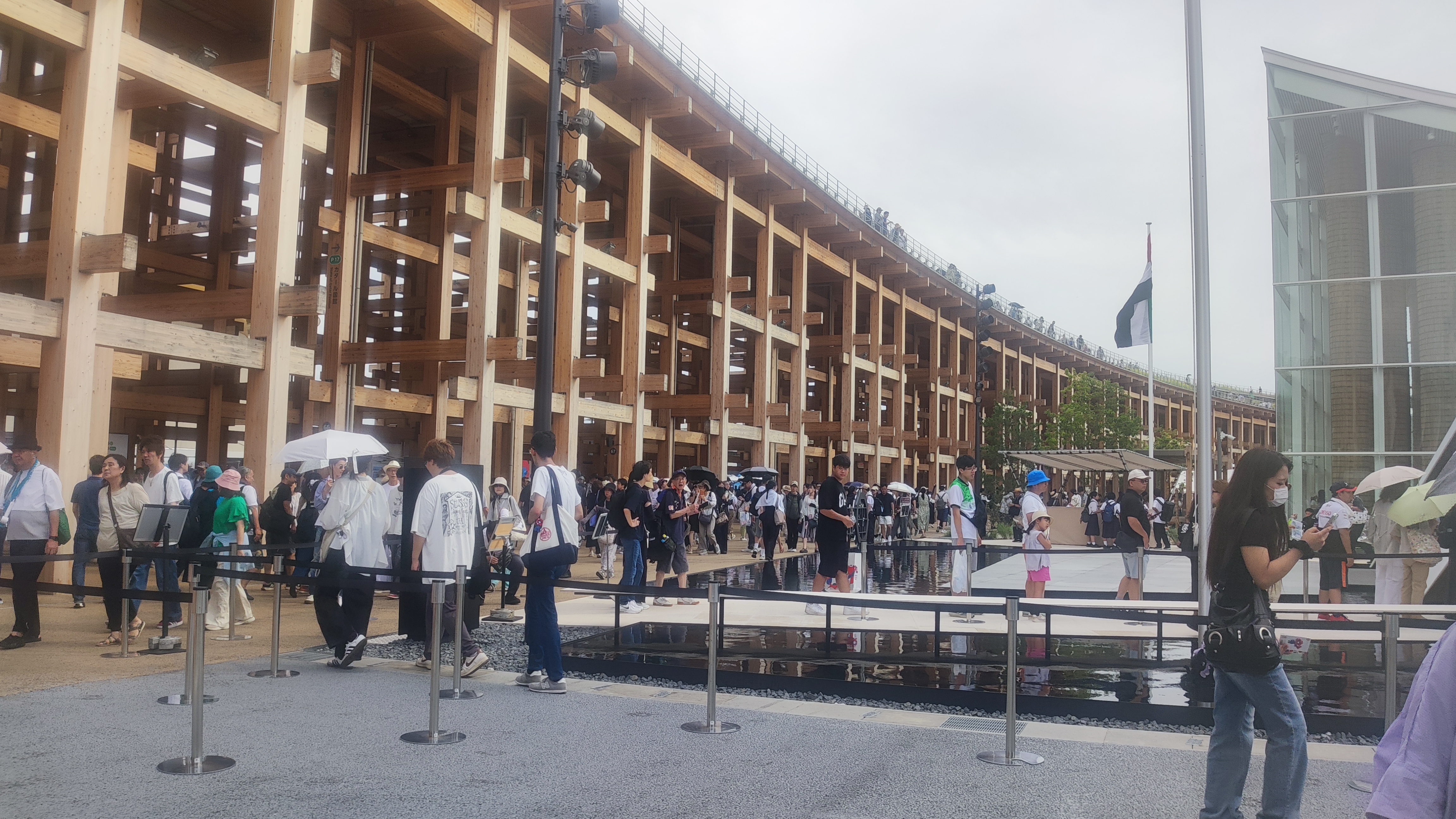 Apenas uno atraviesa las rejas de ingreso a la Expo Osaka 2025, que están fuertemente resguardadas por los guardias y policías, se ve imponente el anillo de madera, cuya forma circular “representa la unidad y la conexión entre países y personas”.