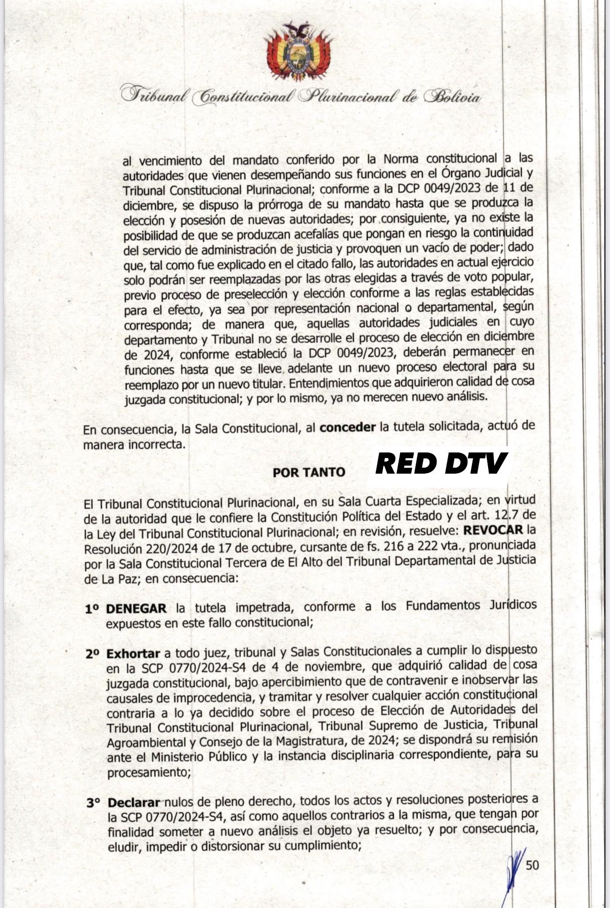 “Exhortar a todo juez, tribunal y Salas Constitucionales a cumplir lo dispuesto en la SCP 0770/2024-S4 de 4 de noviembre, que adquirió calidad de cosa juzgada constitucional, bajo apercibimiento que de contravenir e inobservar las causales de improcedencia, y tramitar y resolver cualquier acción constitucional contraria a lo ya decidido sobre el proceso de Elección de Autoridades del Tribunal Constitucional Plurinacional, Tribunal Supremo de Justicia, Tribunal Agroambiental y Consejo de la Magistratura, de 2024; se dispondrá su remisión ante el Ministerio Público y la instancia disciplinaria correspondiente, para su procesamiento”, refiere el punto 2 del Por Tanto de la sentencia.