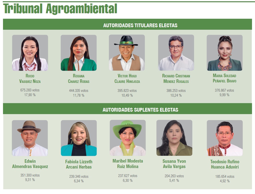 Además de las magistradas para el Tribunal Agroambiental Rocío Vásquez Noza, Roxana Chávez Rodas y María Soledad Peñafiel Bravo y la consejera Gabriela Paula Araoz López.