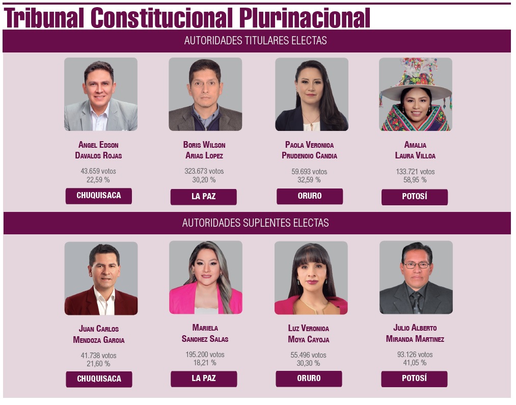 Se trata de 10 varones y 9 mujeres titulares. Las 9 mujeres son las magistradas para el Tribunal Constitucional Plurinacional Amalia Laura Villca (Potosí) y Paola Verónica Prudencio Candia (Oruro); y las magistradas para el Tribunal Supremo de Justicia Rosmery Ruiz Martínez (Tarija), Norma Velasco Mosquera (Potosí) y Fanny Coaquira Rodríguez (La Paz).