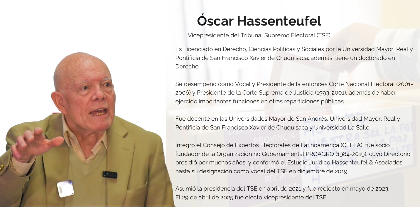 La Paz, 29 de abril de 2025 (ABI). – Oscar Hassenteufel fue elegido vicepresidente de la sala plena del Tribunal Supremo Electoral (TSE) y asumirá interinamente la presidencia hasta tanto se elija al nuevo presidente, que este martes no pudo materializarse, en un hecho sin precedentes.