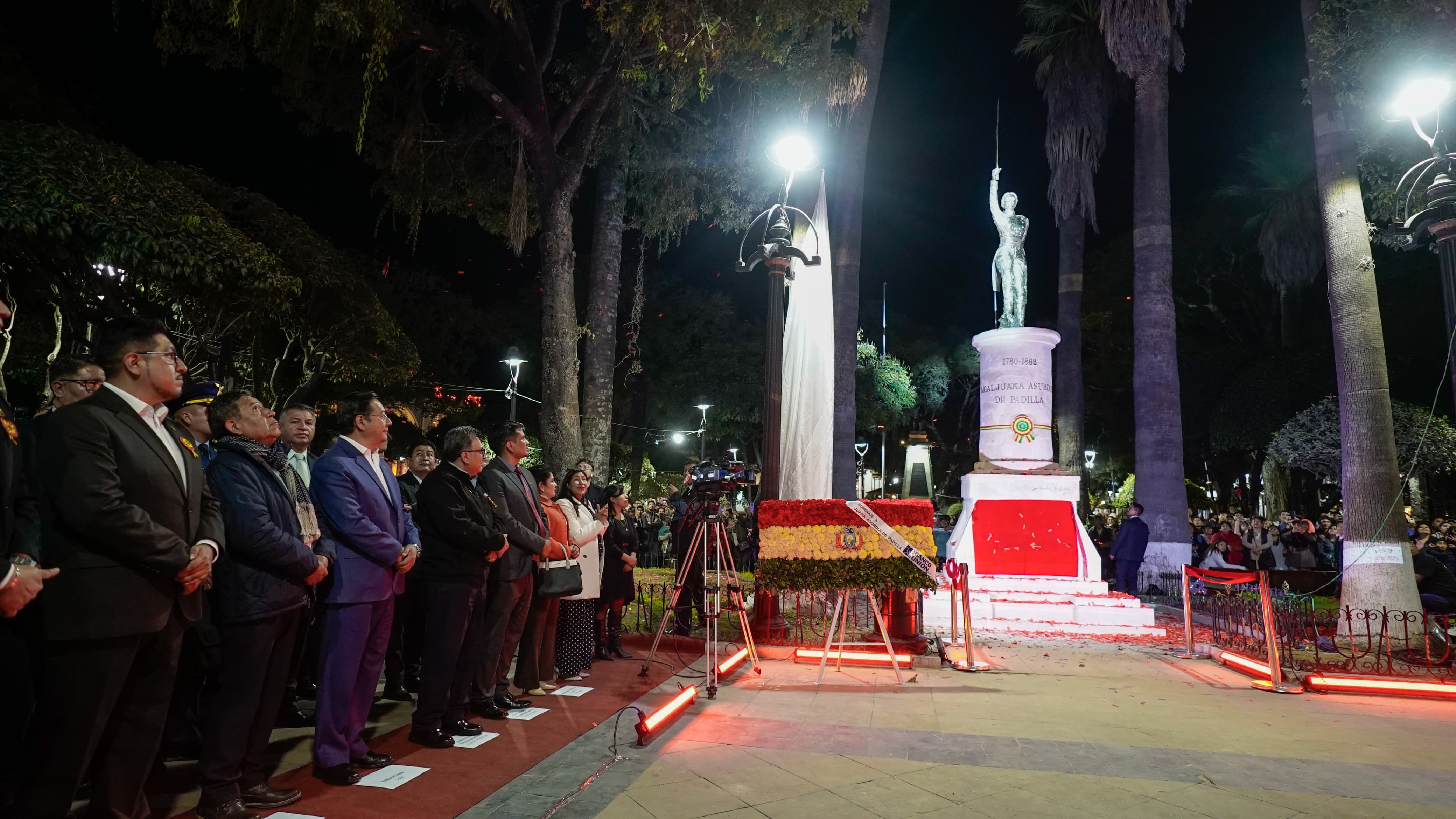 Sucre, 04 de agosto de 2025 (ABI). – Como un homenaje al Bicentenario de Bolivia y a los proceres de la independencia, el presidente Luis Arce descubrió la noche de este lunes el monumento de la general Juan Azurduy de Padilla, emplazado en la plaza 25 de Mayo de la ciudad de Sucre.