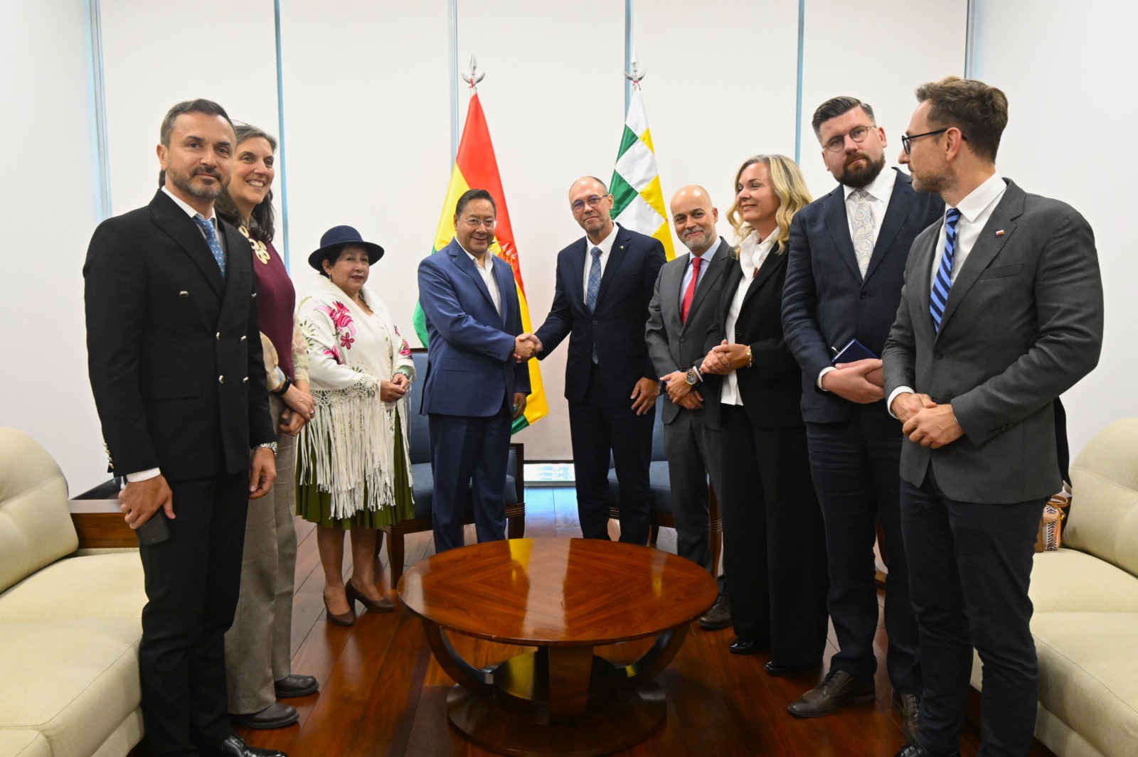 Acompañado de la canciller Celinda Sosa, Arce dio la bienvenida a ambas delegaciones durante un encuentro en la Casa Grande del Pueblo, centro de funciones del Órgano Ejecutivo en la ciudad de La Paz.