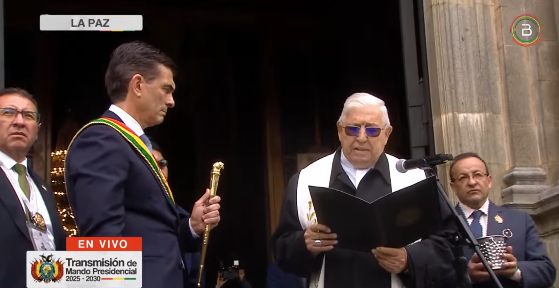 13:29 – El monseñor Jesús Juárez bendice el bastón de mando del presidente Rodrigo Paz y le encomienda trabajar por la paz, la unidad y la reconciliación.