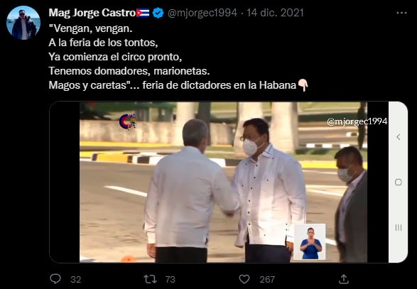 En otro mensaje, acompañado de la fotografía del presidente boliviano y del presidente cubano, Miguel Díaz-Canel, dándose un apretón de manos, escribió: “Vengan, vengan. A la feria de los tontos. Ya comienza el circo pronto. Tenemos domadores, marionetas, magos y caretas…feria de dictadores en La Habana”.