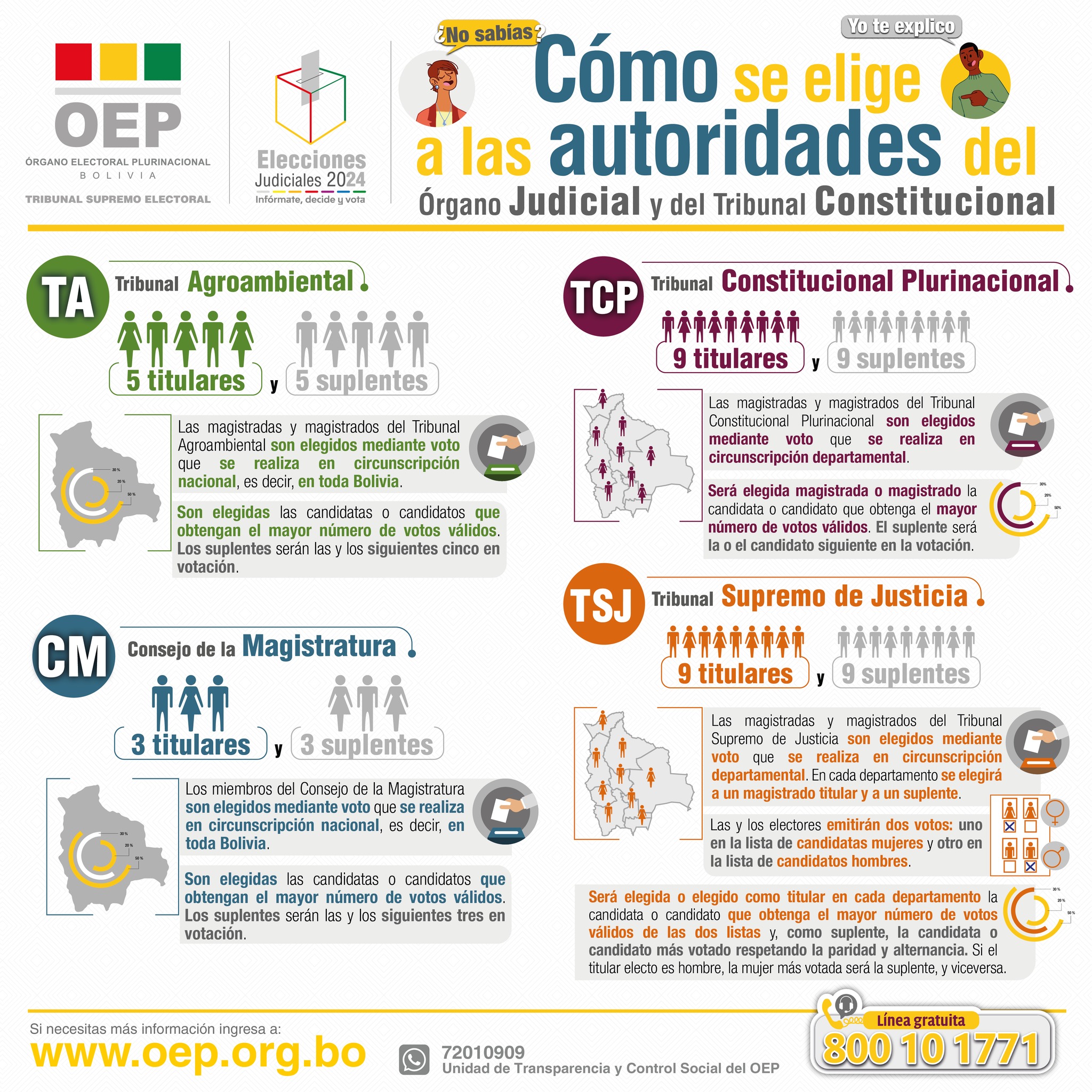 En consecuencia, sólo en Chuquisaca, La Paz, Oruro y Potosí se elegirán a las autoridades de las cuatro instancias: del Consejo de la Magistratura, del Tribunal Agroambiental, del Tribunal Supremo de Justicia y del Tribunal Constitucional Plurinacional.
