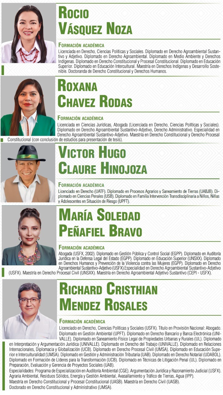 Además de las magistradas electas para el Tribunal Agroambiental (TA) Rocío Vásquez Noza; Roxana Chávez Rodas y María Soledad Peñafiel Bravo y la consejera electa Gabriela Paula Araoz López.