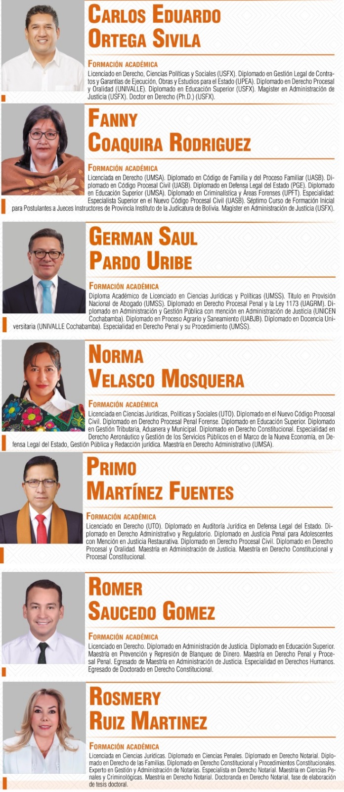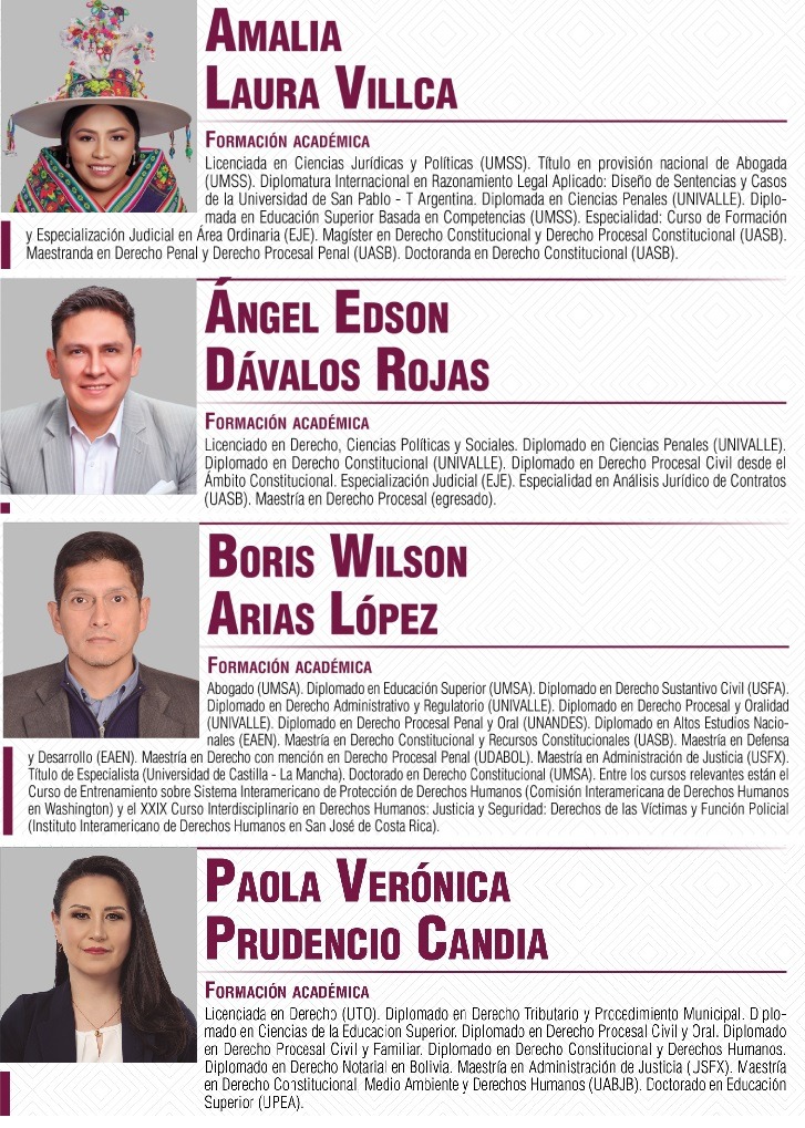 Las 9 mujeres son las magistradas electas para el Tribunal Constitucional Plurinacional (TCP) Amalia Laura Villca (Potosí) y Paola Verónica Prudencio Candia (Oruro); y las magistradas electas para el Tribunal Supremo de Justicia (TSJ) Rosmery Ruiz Martínez (Tarija); Norma Velasco Mosquera (Potosí) y Fanny Coaquira Rodríguez (La Paz).
