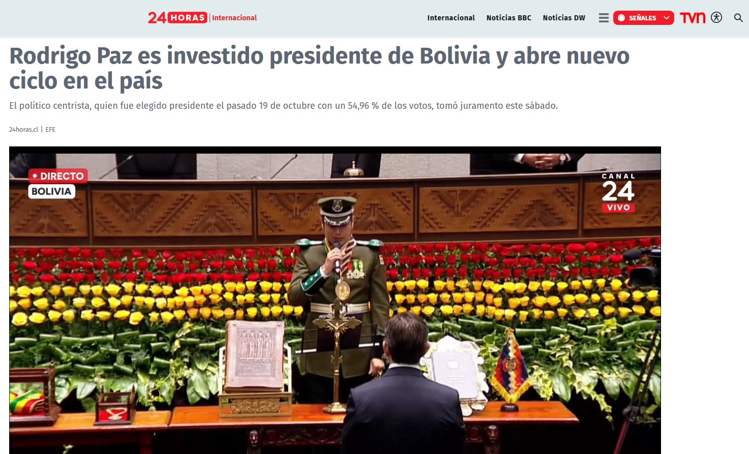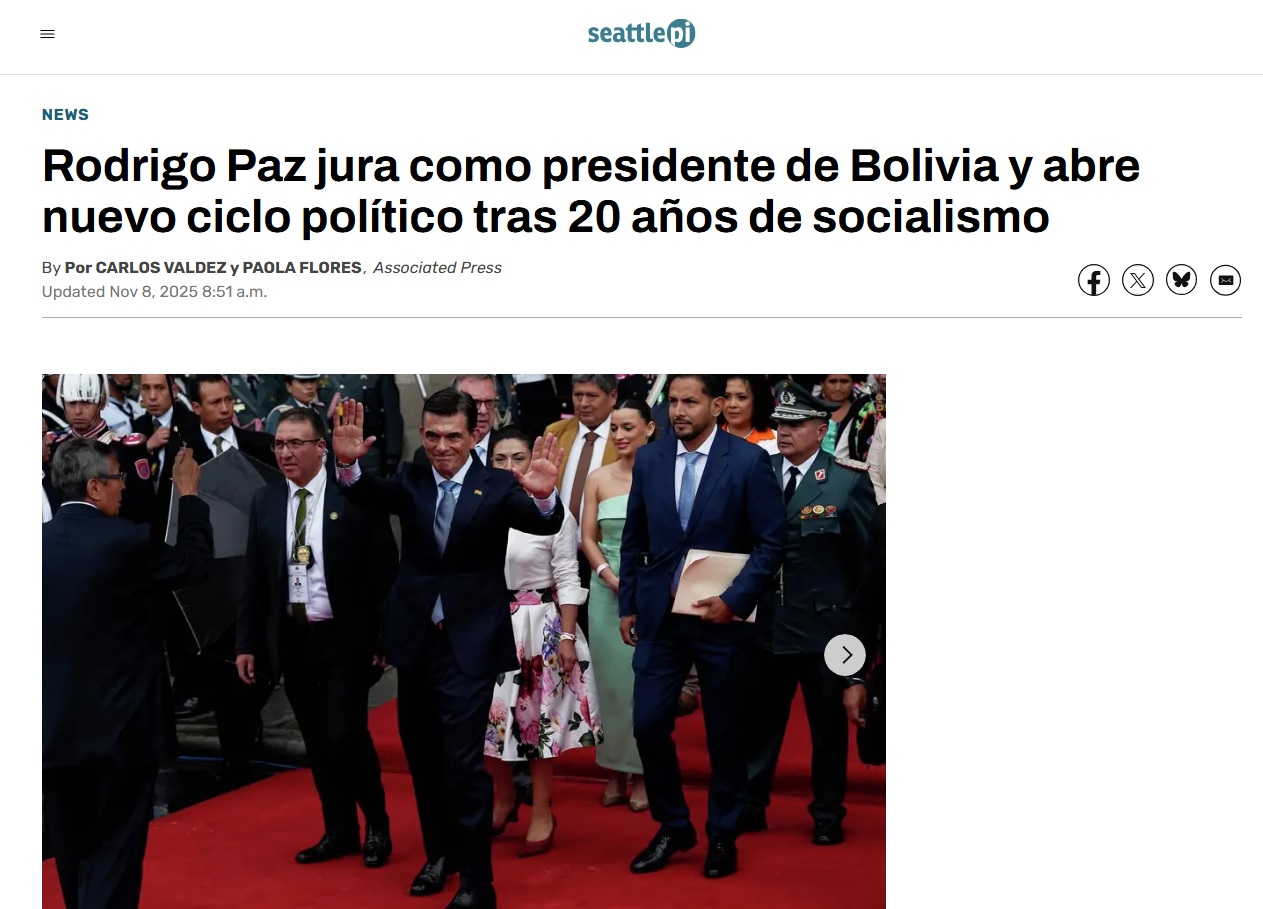 En tanto, la plataforma 24 Horas reportó que “el político centrista Rodrigo Paz Pereira tomó juramento este sábado como el nuevo presidente de Bolivia para un periodo de cinco años, abriendo un nuevo ciclo político y económico en el país suramericano después de 20 años de la izquierda en el poder”.