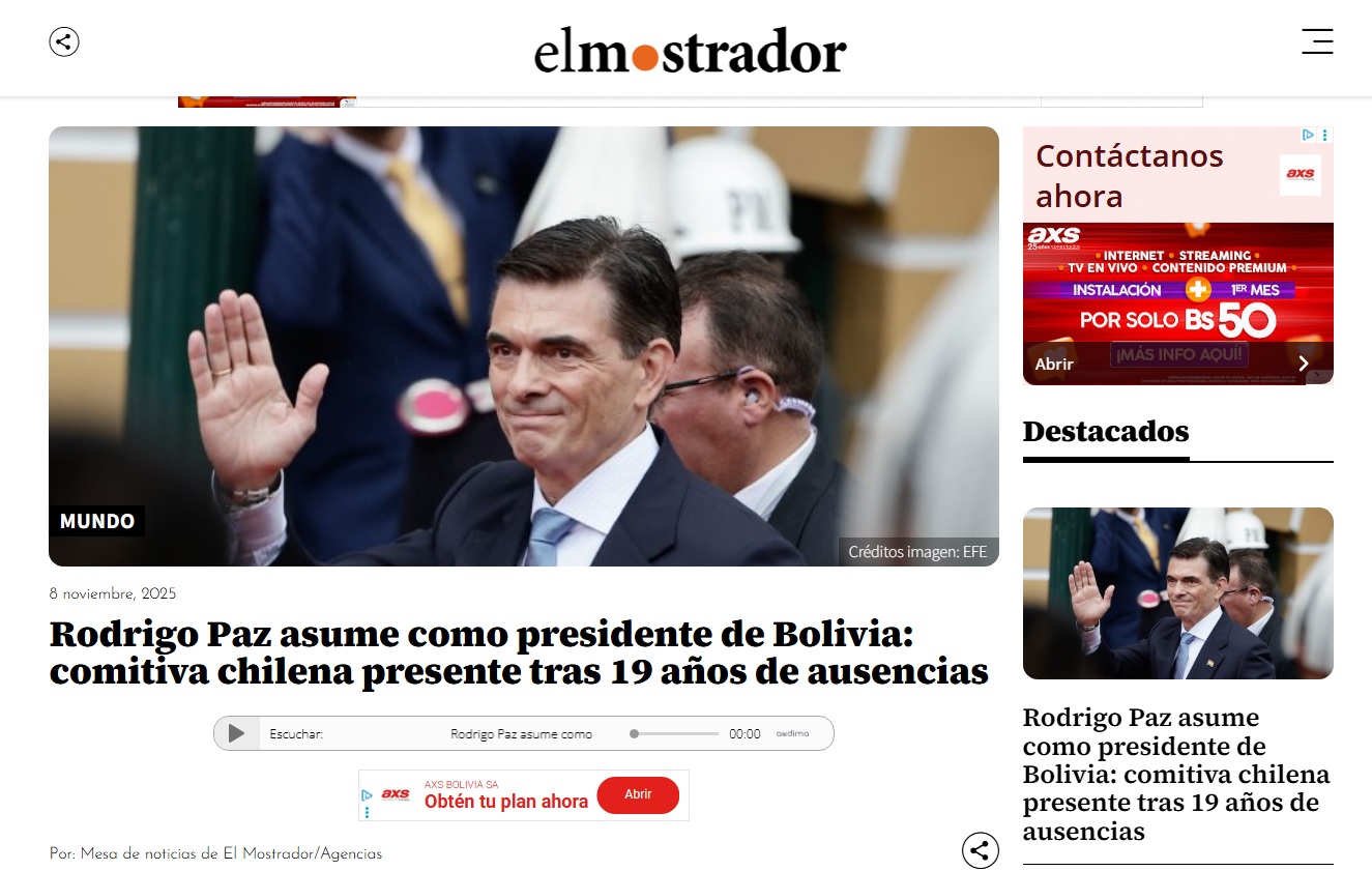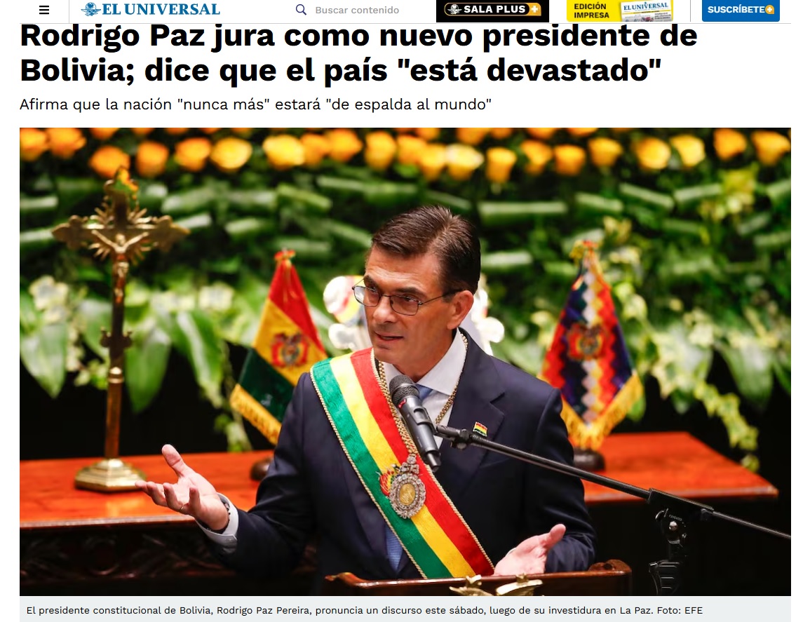 “Rodrigo Paz jura como nuevo presidente de Bolivia; dice que el país ‘está devastado’”, reportó, por su parte, el diario El Universal que, además, resaltó que a la investidura de Paz asistieron los presidentes de Argentina, Javier Milei; Ecuador, Daniel Noboa; Paraguay, Santiago Peña, y Uruguay, Yamandú Orsi, además del subsecretario de Estado de Estados Unidos, Christopher Landau.