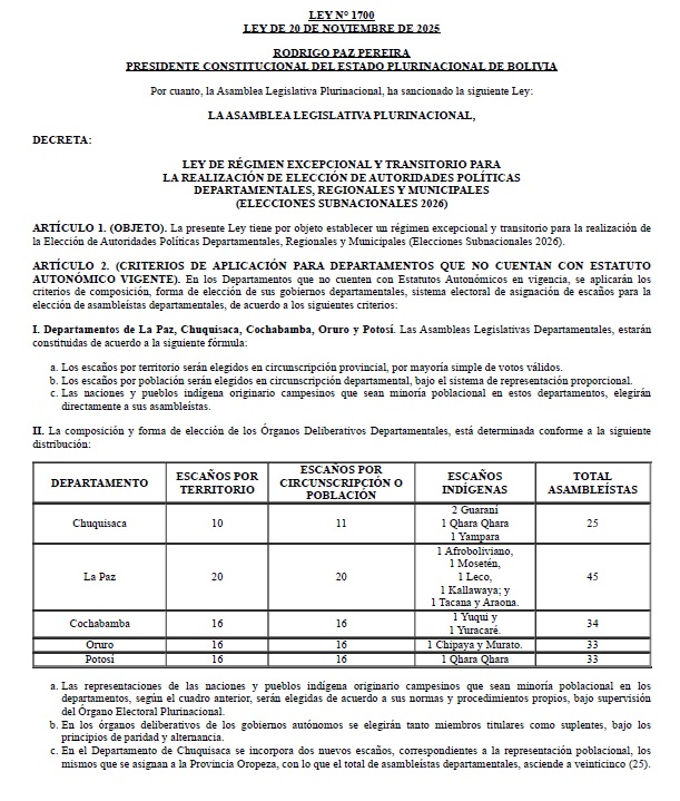 La Paz, 21 de noviembre de 2025 (ABI). – La Gaceta Oficial del Estado publicó el jueves la Ley 1700 de las elecciones subnacionales de 2026, que se constituye en la sexta norma que fue promulgada por el presidente Rodrigo Paz desde que asumió el mando de la nación el 8 de noviembre.