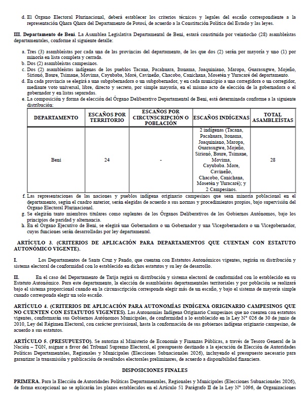 Define todo el marco normativo para las elecciones subnacionales que se realizarán el 22 de marzo de 2025, donde los bolivianos elegirán a más de 5.000 autoridades.