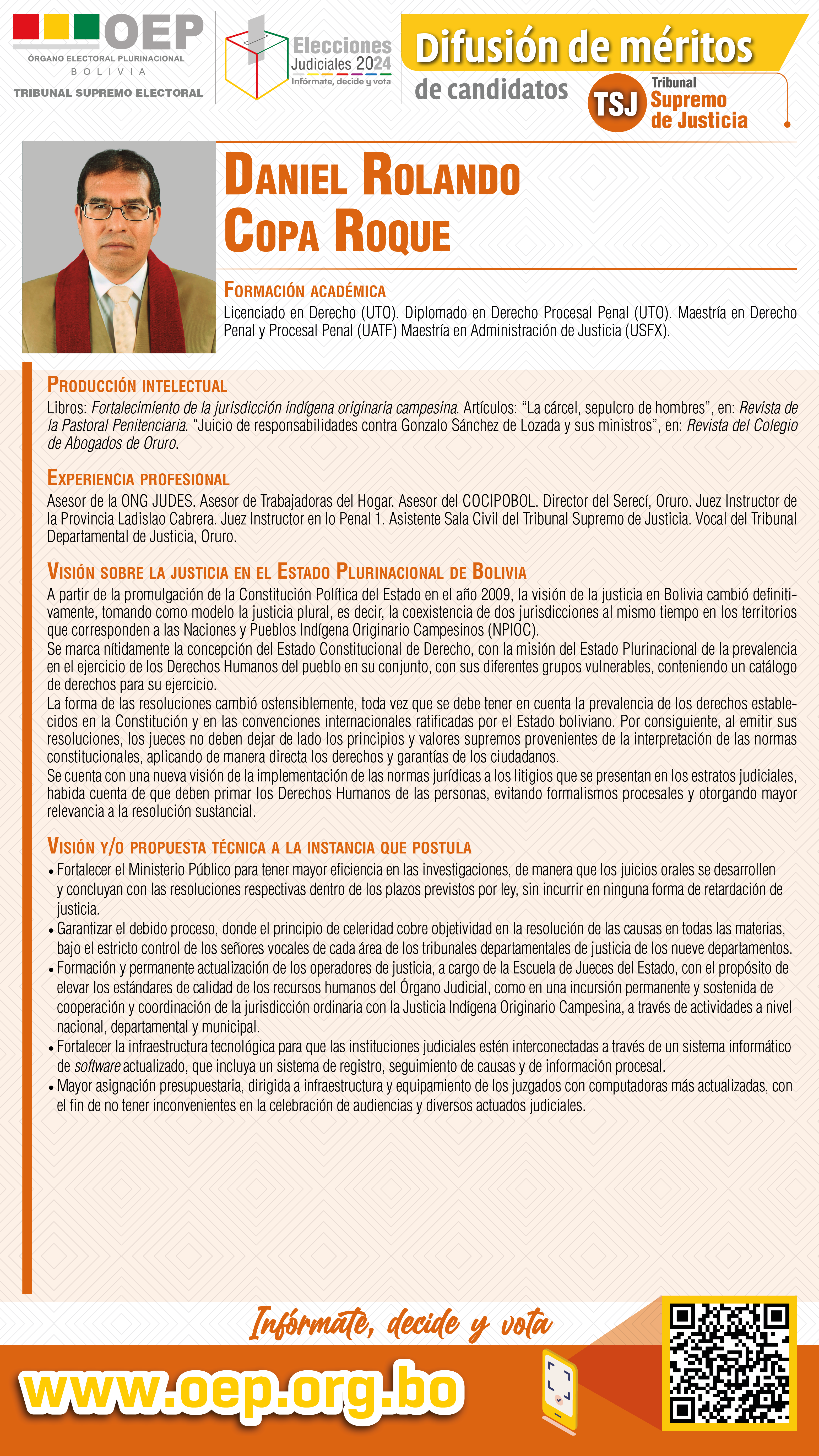 ELECCIONES JUDICIALES: Conozca al candidato al TSJ por Oruro, Daniel Rolando Copa RoqueRedacción centralPolitica 08 Noviembre 2024 Visto: 1225ShareTwittearshare with Whatsappshare with Telegram Leer más: ELECCIONES...