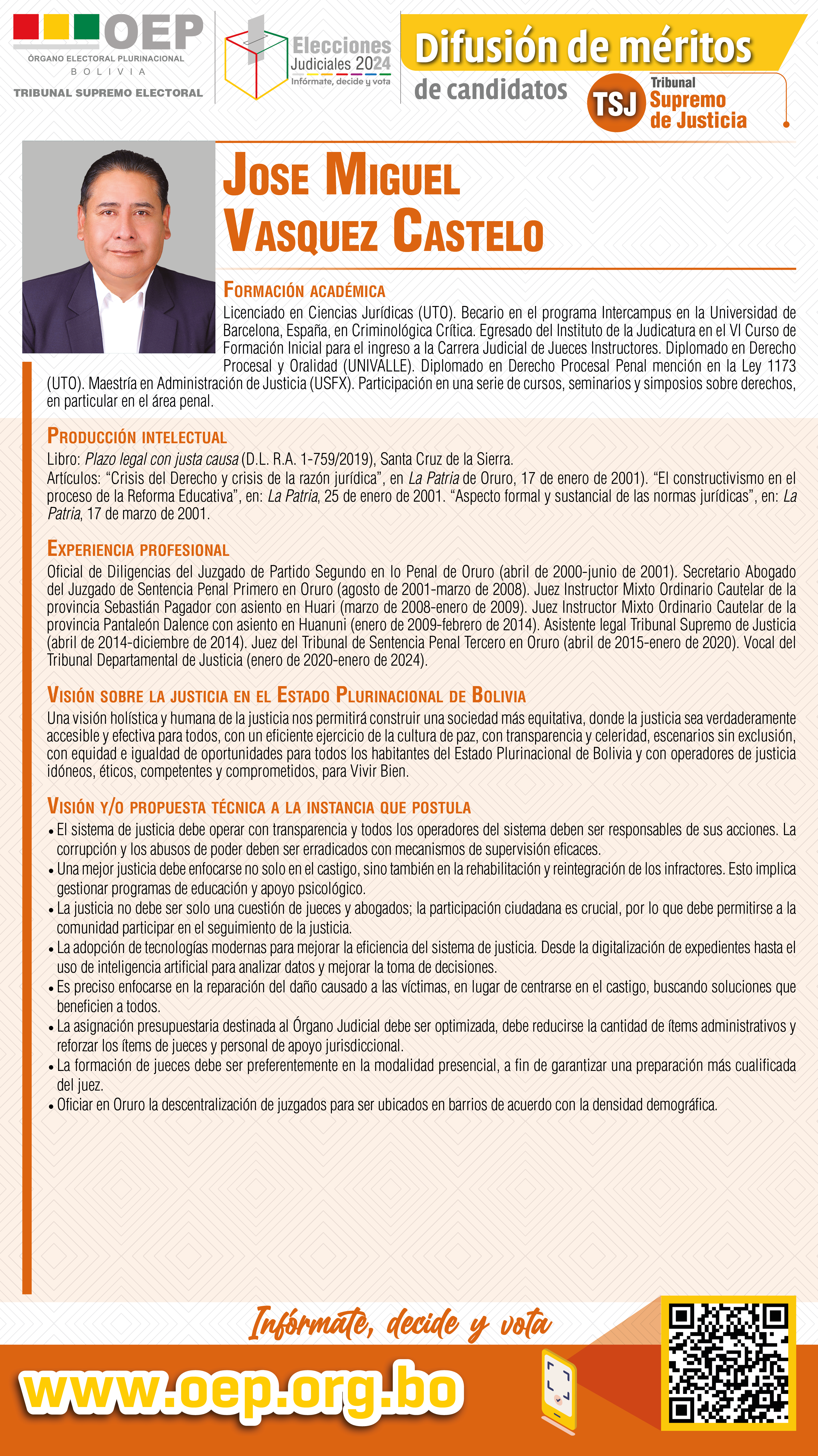 ELECCIONES JUDICIALES: Conozca al candidato al TSJ por Oruro, Jose Miguel Vasquez CasteloRedacción centralPolitica 08 Noviembre 2024 Visto: 1254ShareTwittearshare with Whatsappshare with Telegram Leer más: ELECCIONES...