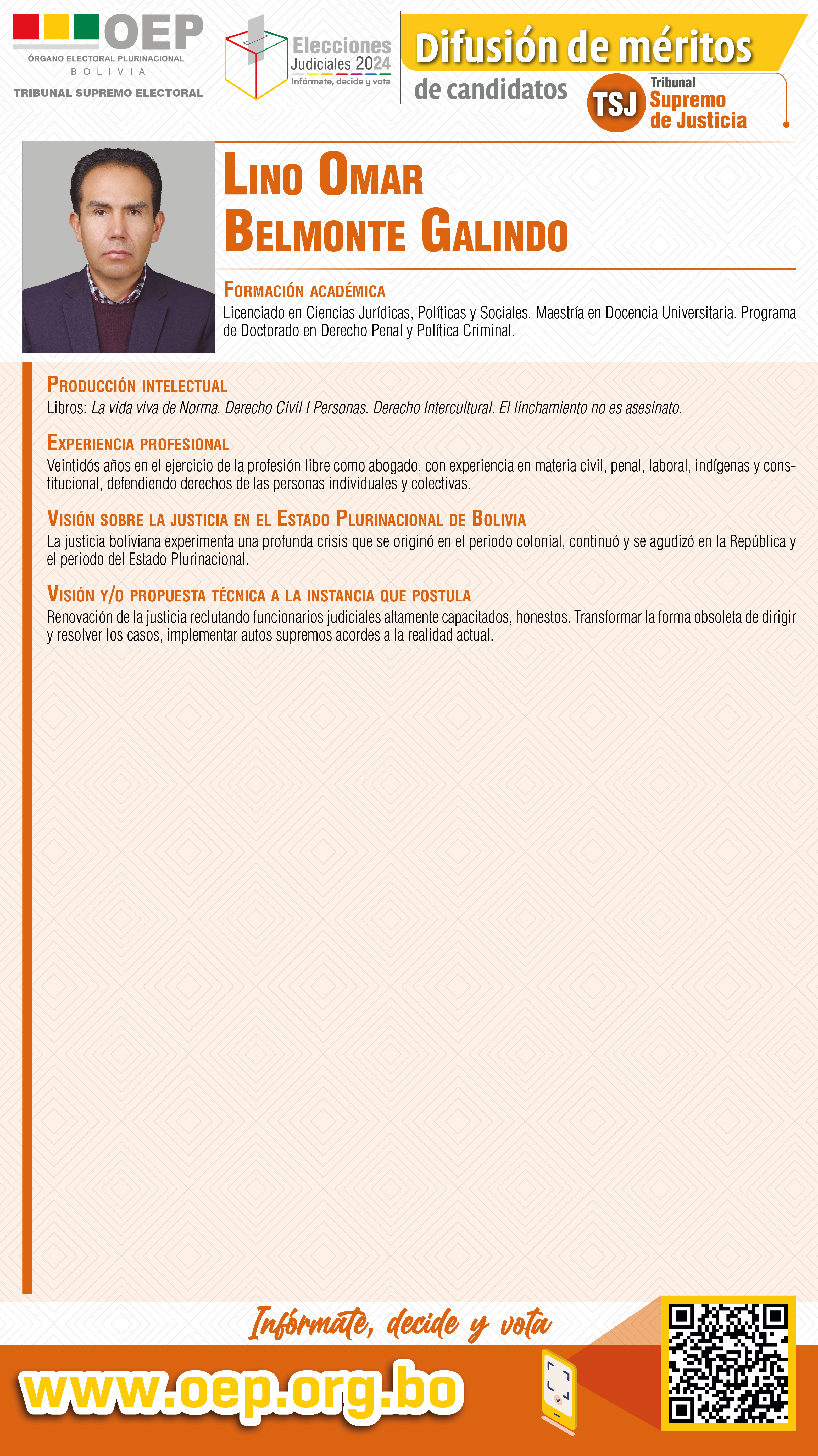 ELECCIONES JUDICIALES: Conozca al candidato al TSJ por Oruro, Lino Omar Belmonte GalindoRedacción centralPolitica 08 Noviembre 2024 Visto: 1460ShareTwittearshare with Whatsappshare with Telegram Leer más: ELECCIONES...