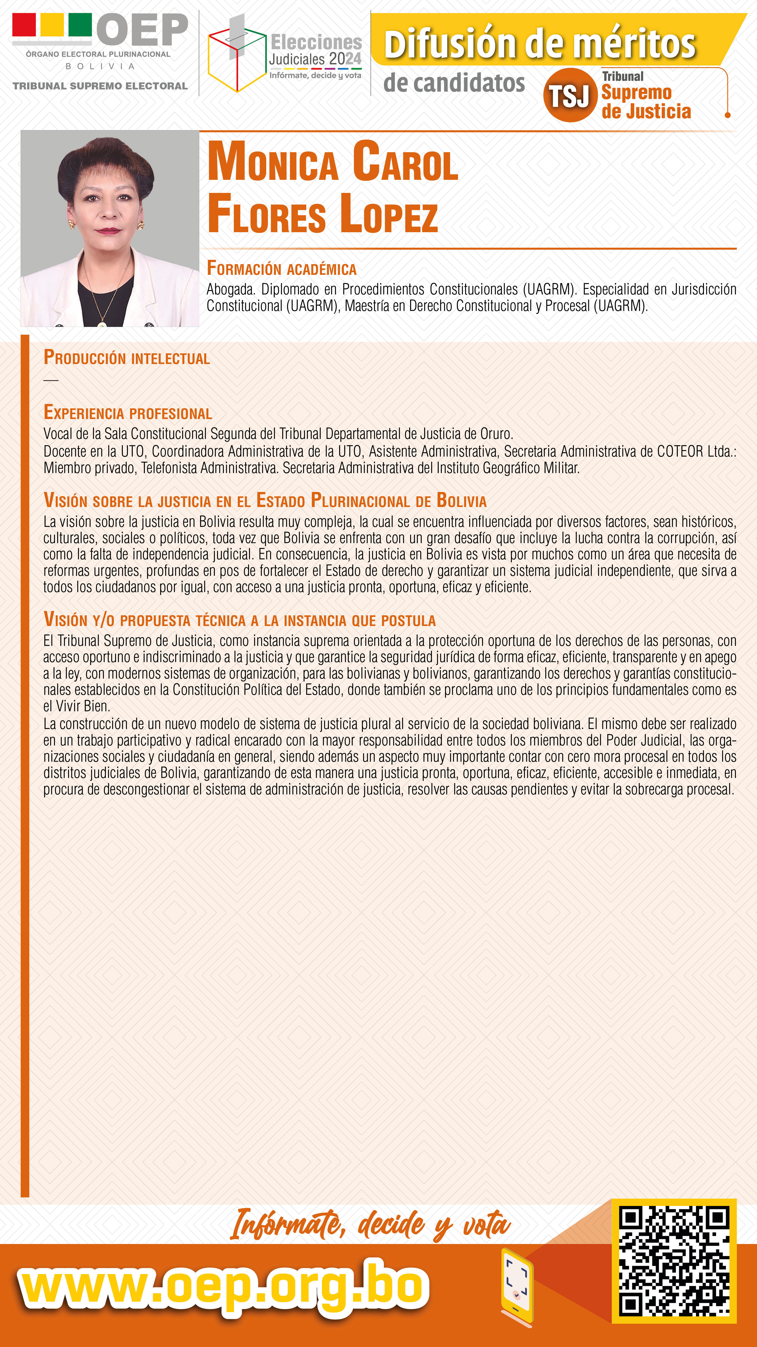 ELECCIONES JUDICIALES: Conozca a la candidata al TSJ por Oruro, Monica Carol Flores LopezRedacción centralPolitica 08 Noviembre 2024 Visto: 1057ShareTwittearshare with Whatsappshare with Telegram Leer más: ELECCIONES...