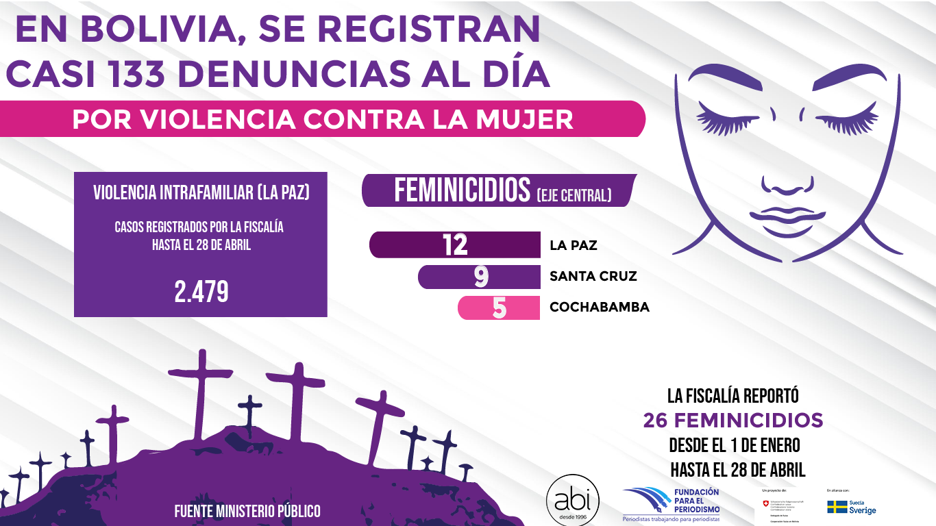 Hasta el 28 de abril de este año, se reportaron 26 hechos de feminicidios en el eje central del país. De esa cifra, La Paz tiene 12 casos, seguido de Santa Cruz con nueve y Cochabamba con cinco, según los datos del Ministerio Público.