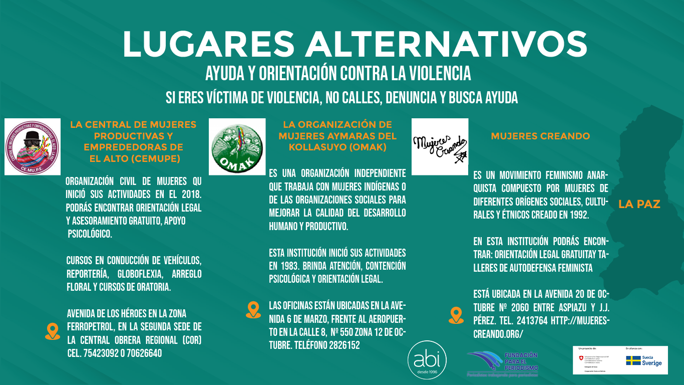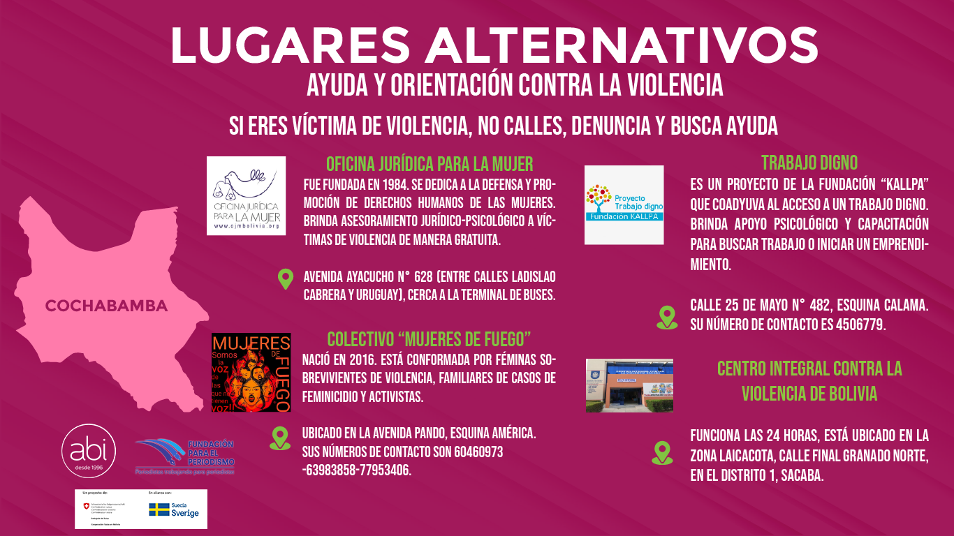 Esta investigación fue realizada con el apoyo del fondo concursable de la Fundación para el Periodismo (FPP) en el marco del proyecto Vida Sin Violencia, un proyecto de la Cooperación Suiza en Bolivia en alianza con la Agencia Sueca de Desarrollo Internacional (ASDI), implementado por Solidar Suiza.