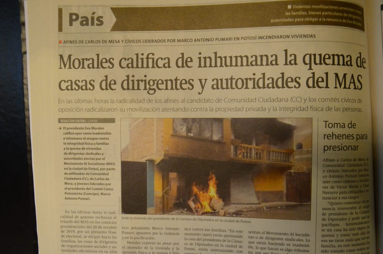 Ocurrió lo mismo con los bienes del presidente de la Cámara de Diputados, Víctor Borda, la hermana de Evo Morales, gobernadores, legisladores y dirigentes del MAS: todo consumido por el fuego asesino.