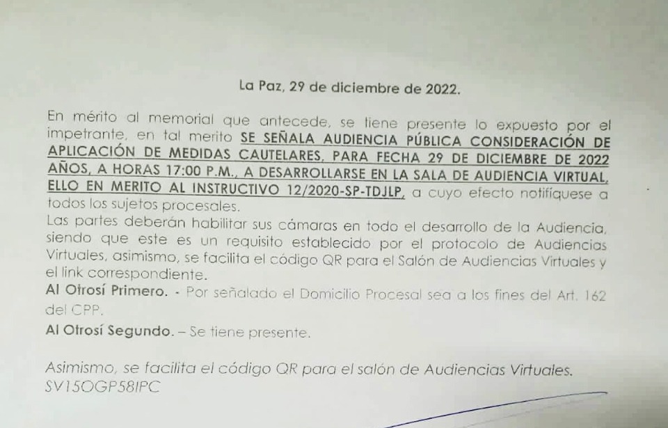“En merito al memorial que antecede, se tiene presente lo expuesto por el impetrante, en tal merito se señala audiencia pública consideración de aplicación de medidas cautelares para fecha 29 de diciembre de 2022, a horas 17:00 a desarrollarse en la sala de audiencia virtual ello en merito al instructivo 12/2020-SP-TDJLP”, señala parte del documento judicial.