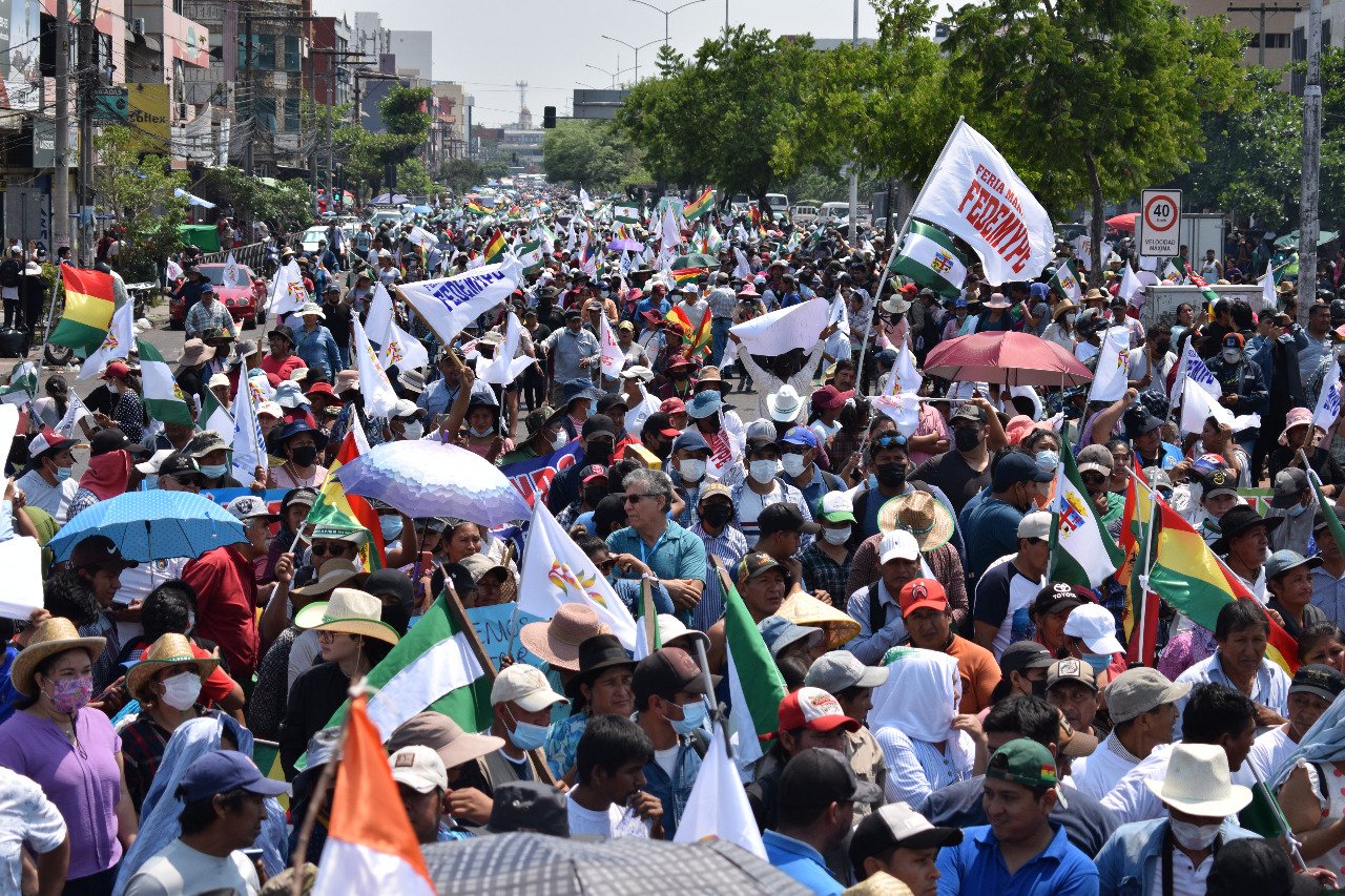 La mañana del viernes, diversas organizaciones sociales, entre transportistas, gremiales, campesinos, amas de casa y otros se movilizaron por las calles cruceñas en una marcha pacífica que pedía terminar con el paro cívico impuesto con bloqueos y violencia.