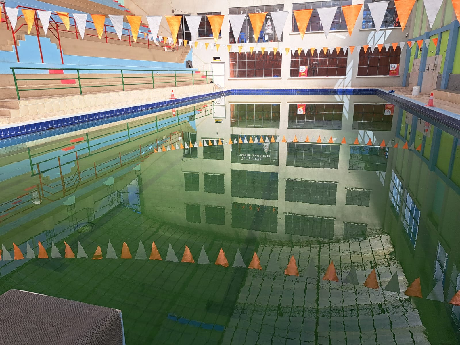 La Paz, 02 de marzo de 2023 (ABI). – Las calaminas rotas, el derroche abundante de agua, los purificadores en mal estado, goteras, la piscina llena de agua maloliente y en plena putrefacción, son algunas de las irregularidades develadas este jueves durante una inspección en la Piscina Municipal de Obrajes.